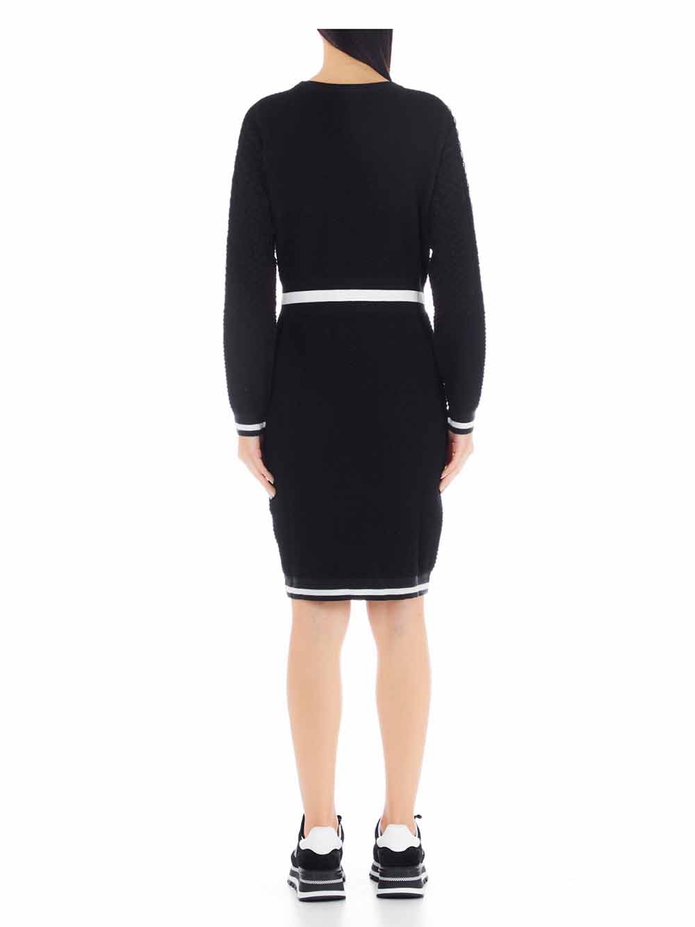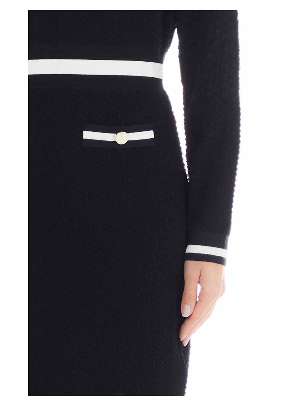 Abitino donna nero stile Chanel anni ’80, in tessuto di viscosa pesante goffrato con lavorazione geometrica a rilievo, manica lunga, scollo rotondo, doppie taschine sul punto seno e sul davanti laterali rifinite con bottoni gioiello oro. Sul punto vita è inserita una fascia elastica a mo’ di cintura beige/lurex doré in contrasto colore, come sui taschini, sul fondo manica e sul finale che va leggermente a stringere.