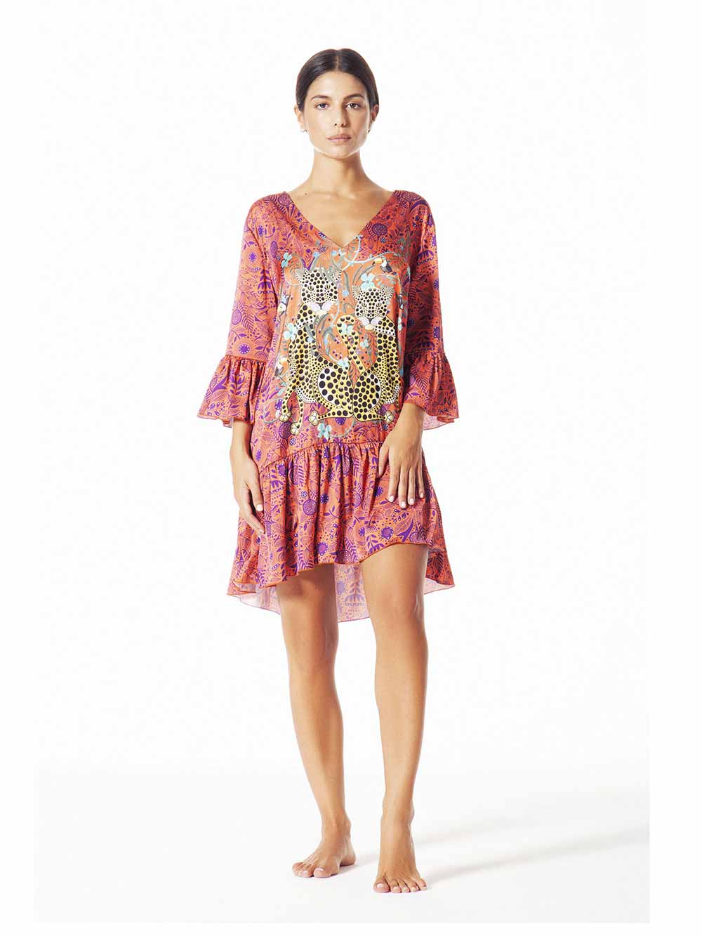 Abitino corto/casacca donna in raso di microfibra molto scivoloso e cascante, tutto fantasia sui toni dell’arancio scuro/viola/turchese + stampa centrale sul davanti stile animalier sui toni del giallo/nero/verde, scollo a V sul davanti, maniche 3/4 con voulant finali, leggermente a trapezio con gala finale.