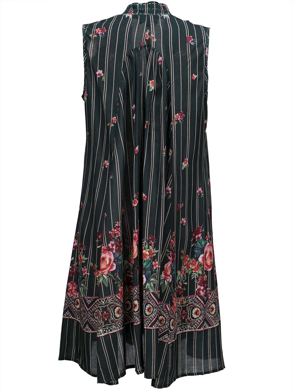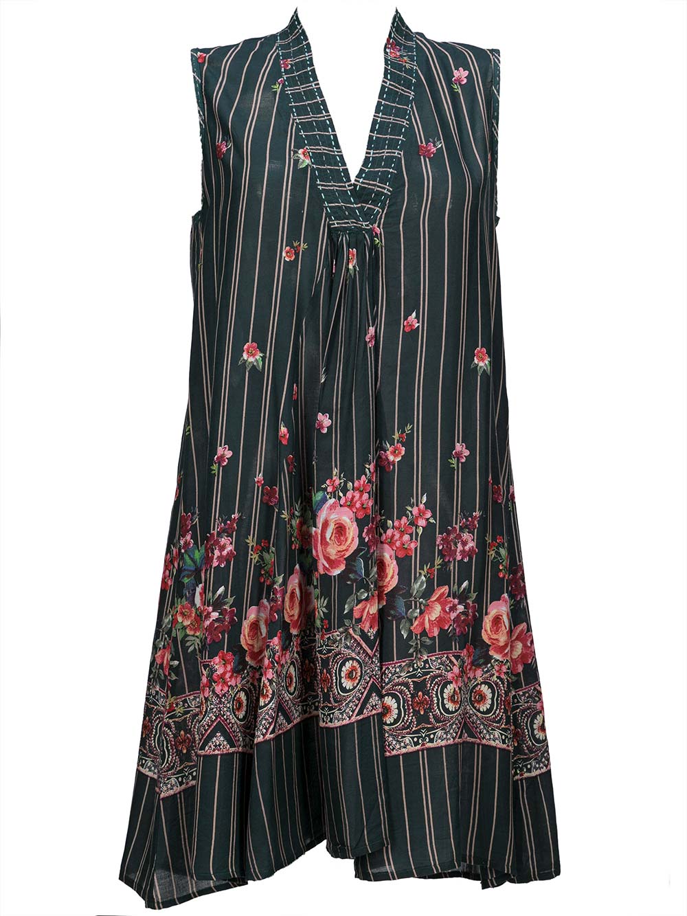 Abitino mare/città donna leggero verde scurissimo con microrighe beige + fiorellini sparsi sui toni sfumati del rosa/bordeaux in modal cascante, forma svasata a trapezio, mezzaruota, spalla larga smanicato, scollo a V incrociato sul davanti, ricca stampa floreale + greca sulla parte bassa dell’abito.