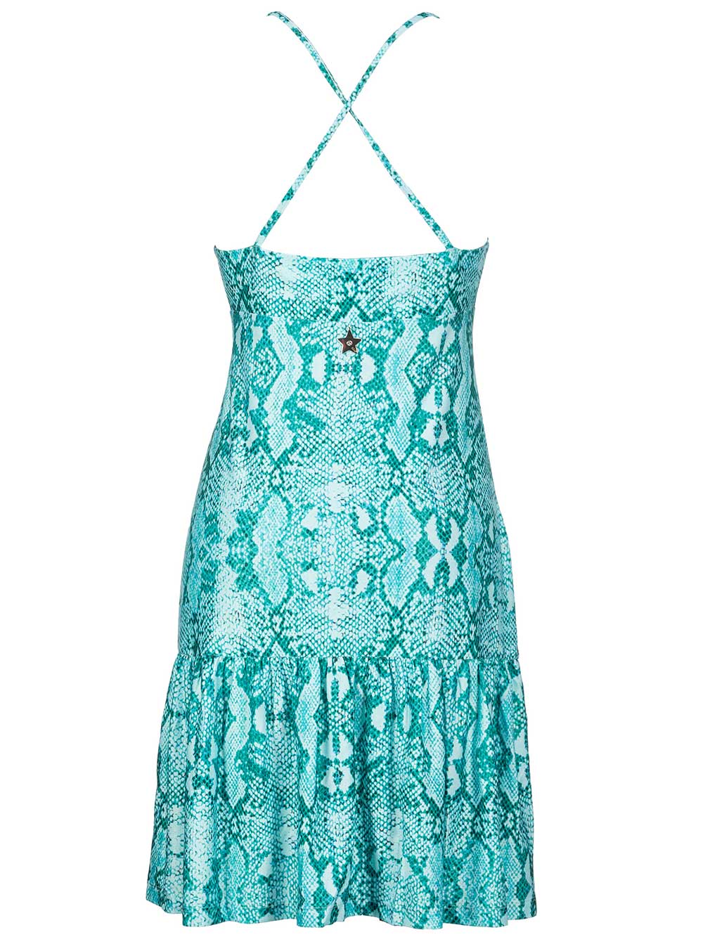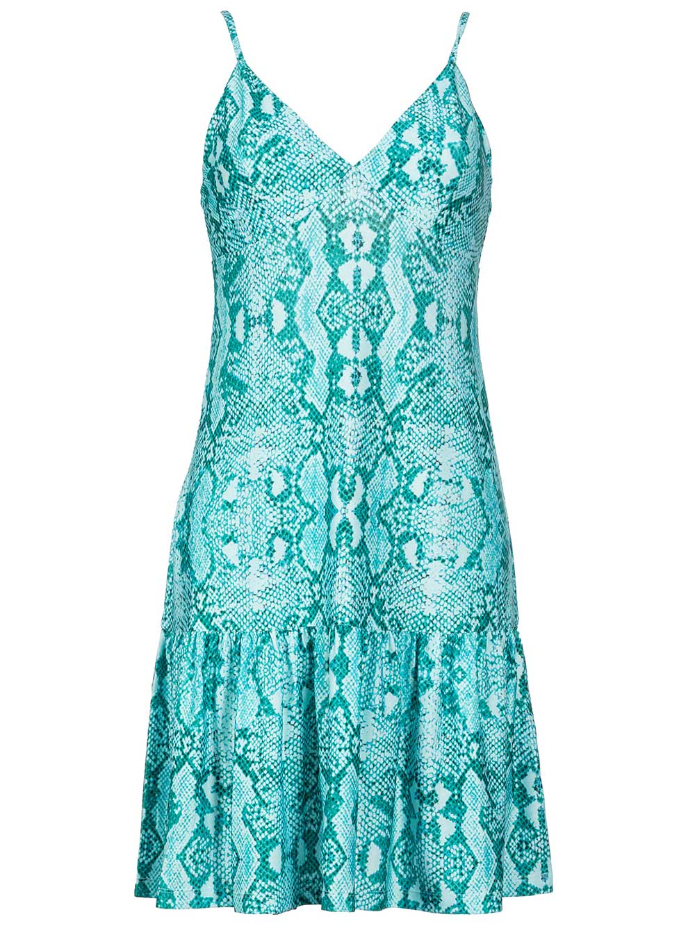 Abitino mare/città donna fantasia animalier pitonato sui toni del verde smerlado/verde menta/acquamarina in jersey di microfibra scivoloso e molto cascante, scollo sottabito con spallini incrociati sul dietro, scollo a triangolo sul davanti con doppia foderata, taglio pari dritto sul dietro, parte alta semi-appoggiata, leggermente svasto sul fondo con gala finale, lunghezza sopra il ginocchio.