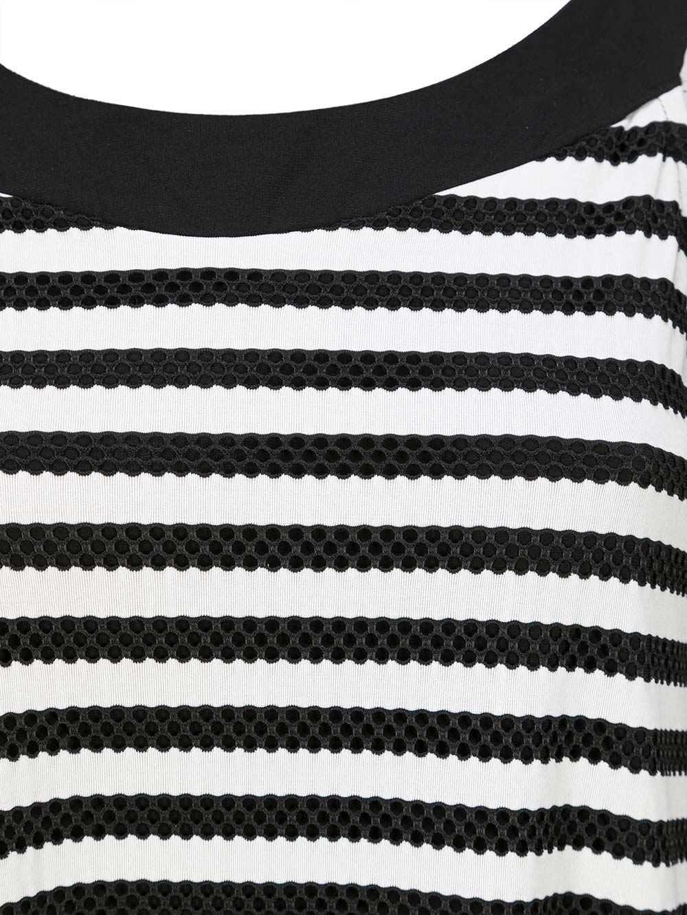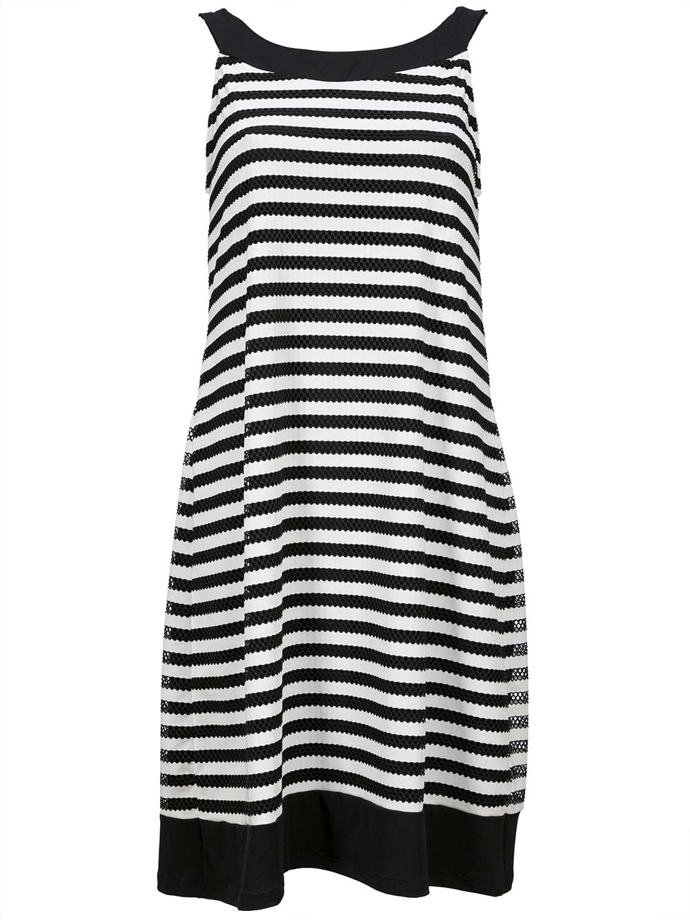 Abitino mare/città donna fantasia righe orizzontali bianconere in jersey rasato cascante lavorazione a rete, tutto doppiato, scollo rotondo, smanicato spalla media, svasato sul fondo con balza nera a chiusura, no trasparente.
