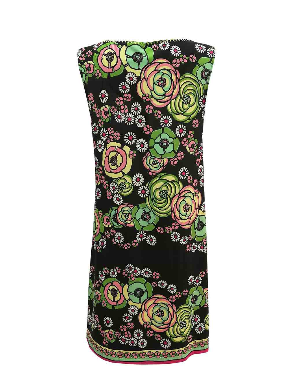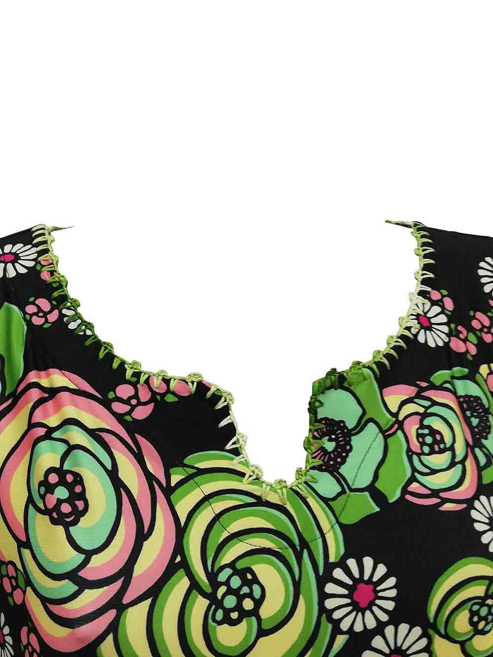 Abitino mare/città donna fantasia new floreale sui toni del giallo/rosa/verde erba/verde menta/avorio fondo nero in jersey leggero, scivoloso e cascante di altà qualità, forma giromanica, scollo ampio rotondo più ricca lavorazione artigianale a uncinetto con filo in sfumature dei verdi, semi dritto, leggermente svasato sul fondo.