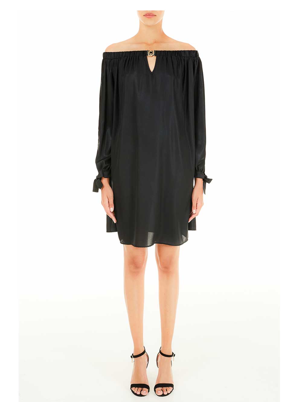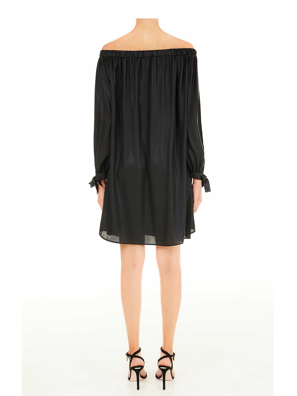 Abito elegante donna nero leggermente microglitterato molto delicato effetto semilucido, in crèpe leggero cascante, scollo pari sulle spalle con elastico antiscivolo, pisccola apertura centrale a goccia + gioiello dorato a vista anallergico + strass, maniche lunghe con alccetto finale tutte aperte laterali a goccia, forma sul fondo svasata a trapezio, da portare anche con cintura in vita.