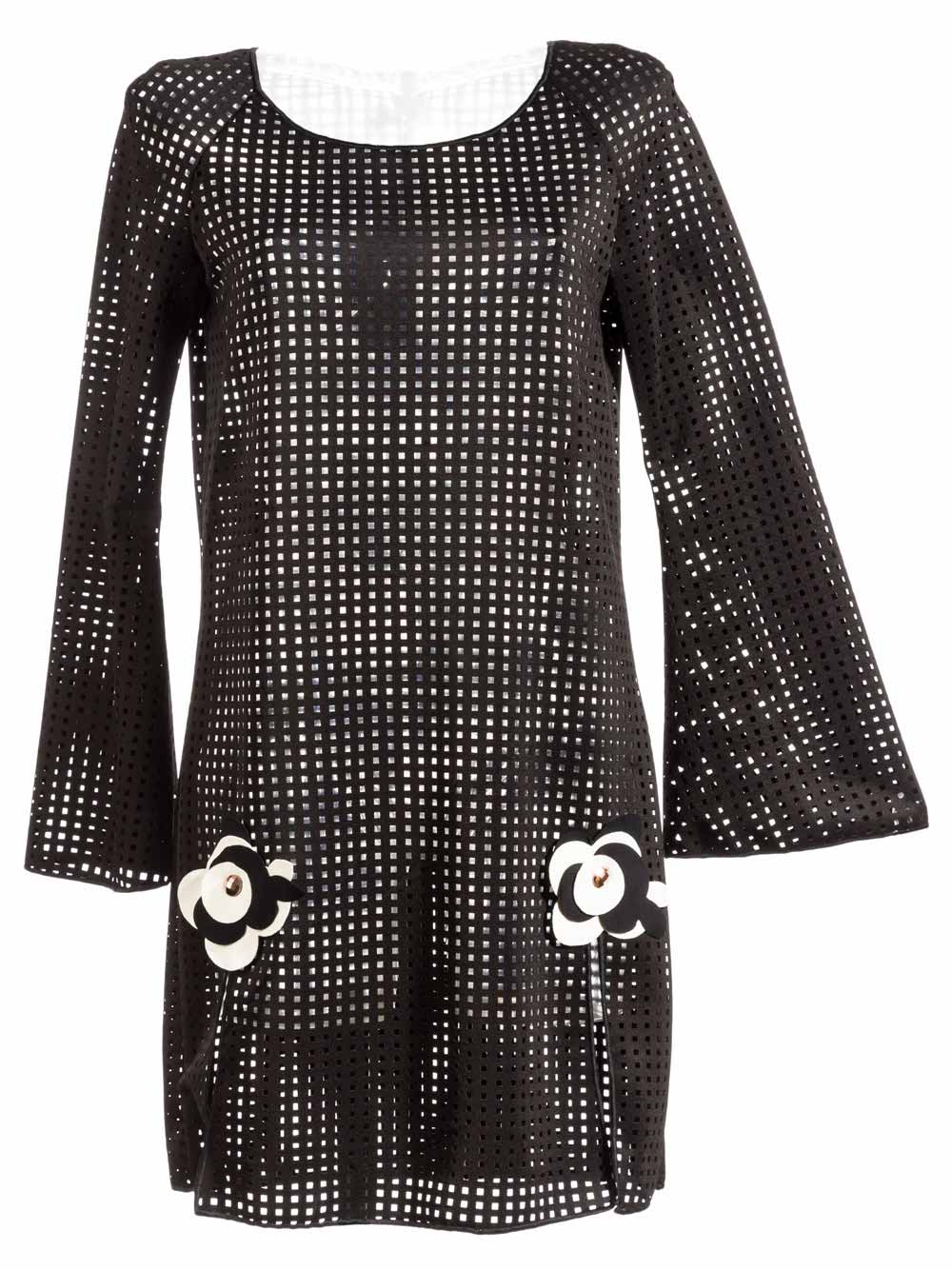 Abito/kaftano donna nero, tutto traforato laser effetto rete bloccata. Maniche svasate, dritto sul fondo con spacchi sul davanti rifiniti con accessori floreali amovibili.
