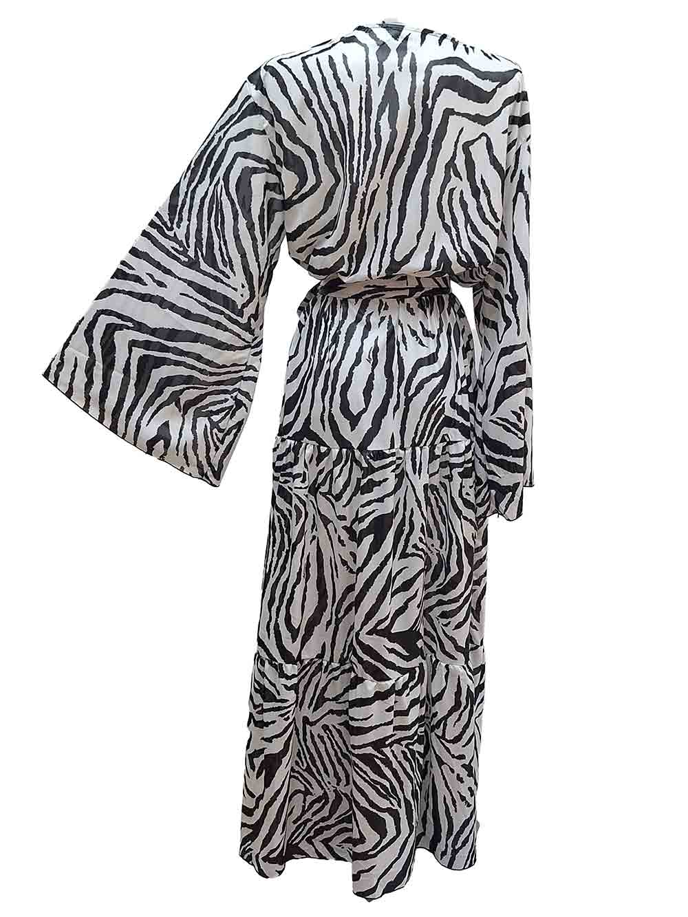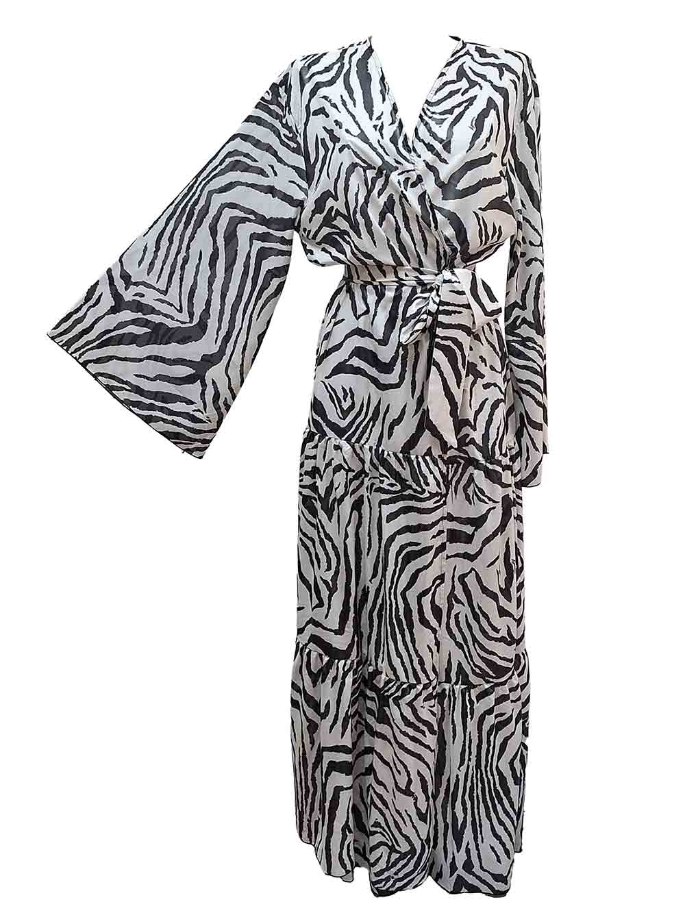 Abito lungo donna fantasia animalier zebrato bianco/nero in leggero tessuto cascante, manica lunga svasata a ventaglio stile caftano, incrociato e sovrapposto sul davanti con bella fascia cintura punto vita, lunghezza fino a terra con balze a rifinitura a svasare.
