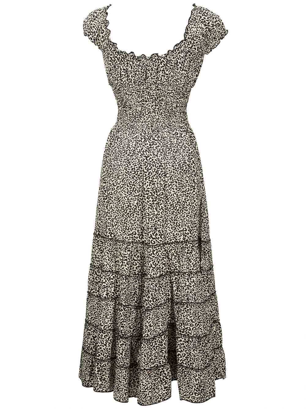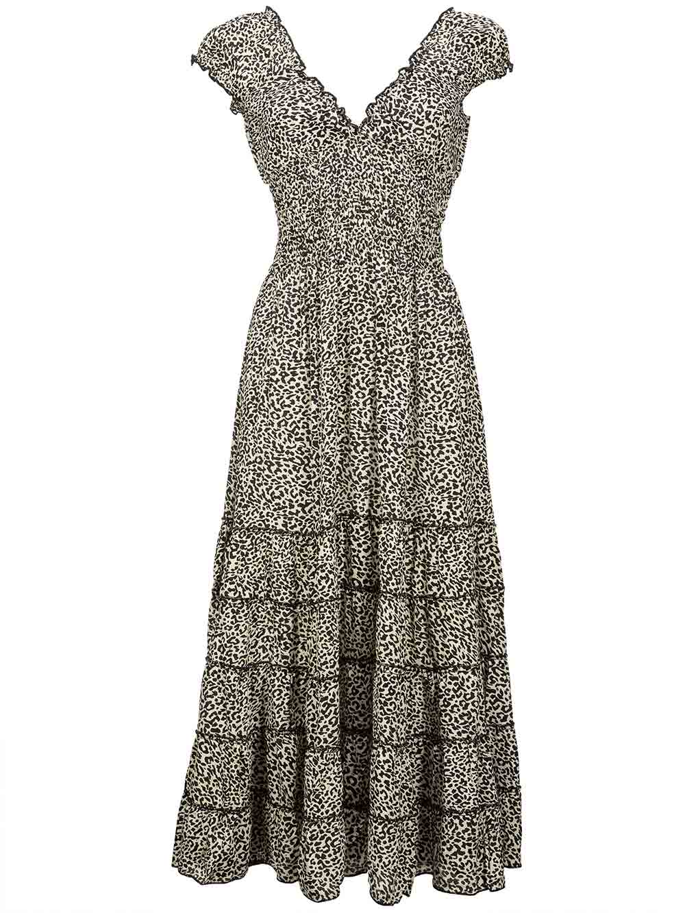 Abito lungo donna mare/città stampa animalier nero/beige in tessuto scivoloso e cascante, scollo a V arricciato sul davanti, scollo rotondo sul dietro, manichina calata, balza arricciata punto vita fino al sottoseno, forma sui fianchi a svasare con microgale finali effetto ruota.