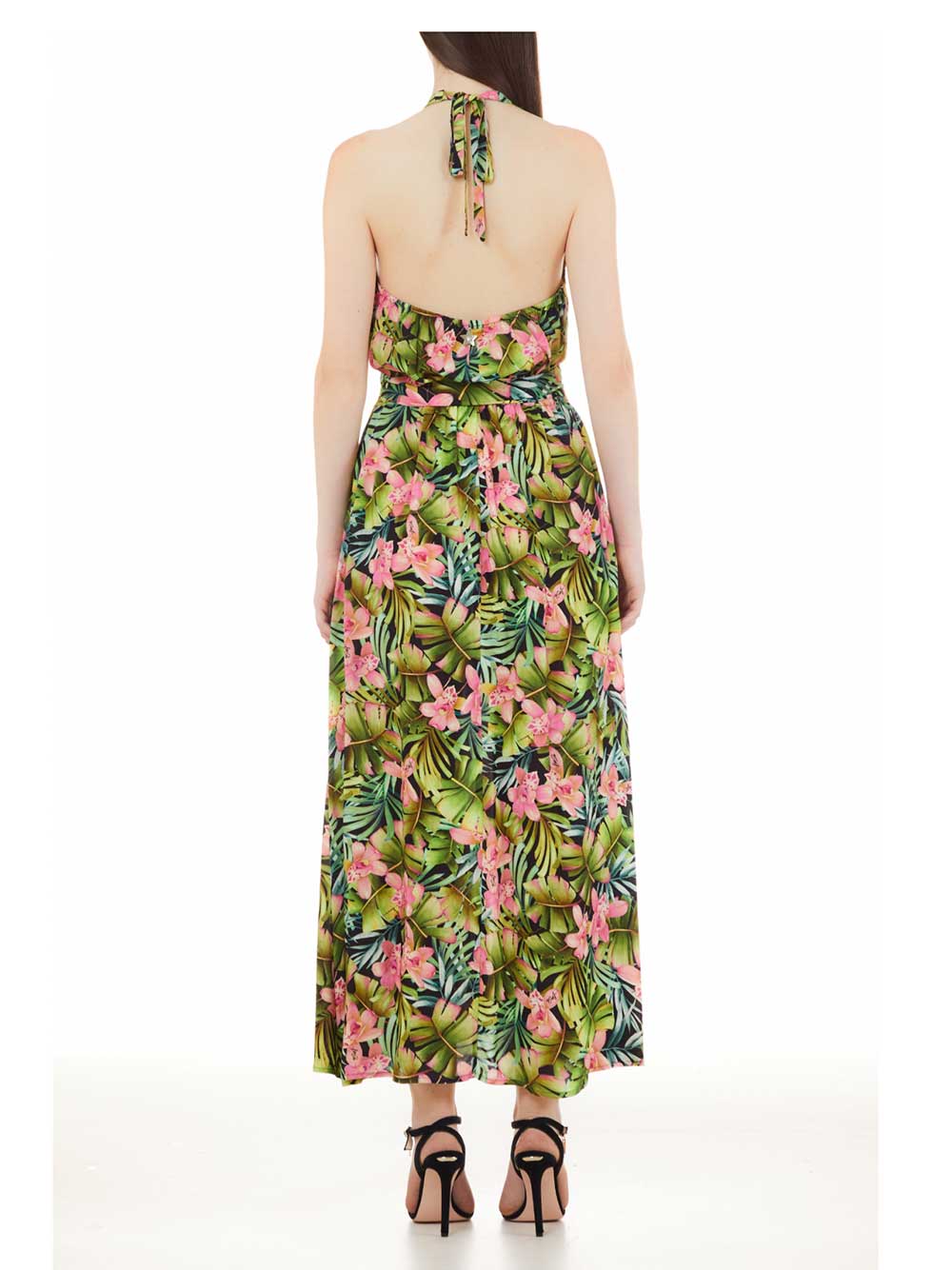 Abito lungo donna stampa esclusiva logata floreale orchidea/giungla sulle sfumature dei rosa/fucsia/verdi/nero in tessuto di viscosa naturale molto cascante, scollatura all’americana, allacciatura al collo dietro con laccetto, spalle nude sul dietro, punto vita con arricciatura morbida, svasato sul fondo, munito di cintura in tessuto stessa fantasia, lunghezza alla caviglia.