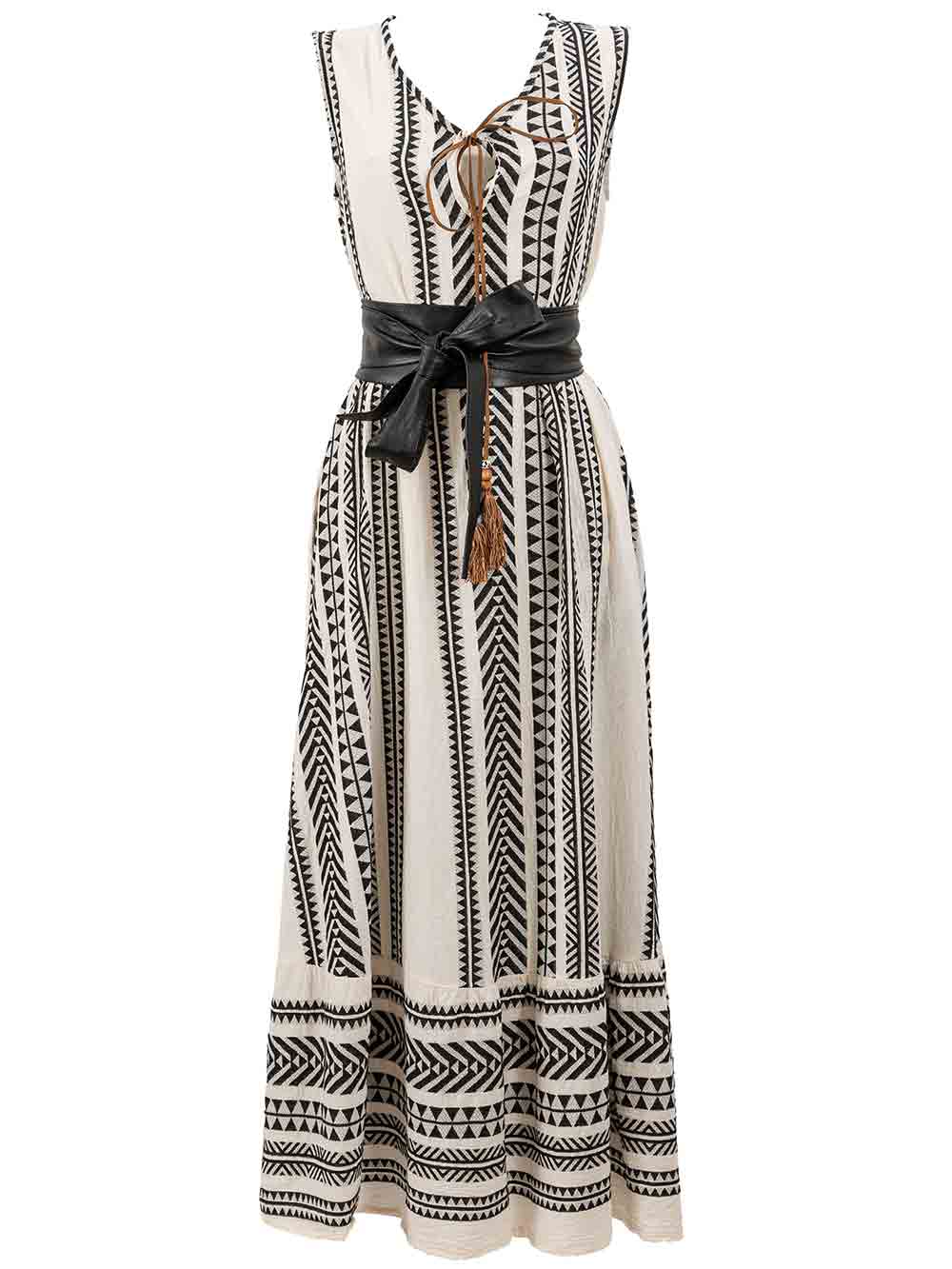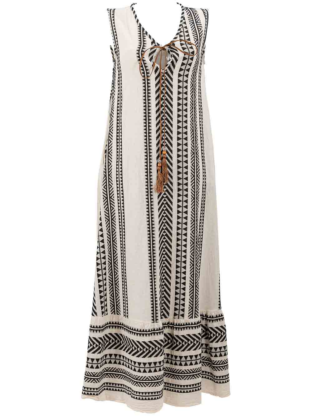Abito lungo donna fondo ecrù con lavorazione su tessuto naturale effetto canapa stropicciata, la stampa è tribale sui toni del nero a contrasto, scollo V sul davanti + goccia e laccetto in pelle regolabile + frappe finali, smanicato, accollato sul retro, linea svasata a trapezio sul fondo + balza finale con stampa orizzontale, portabile con e senza cintura. L’accessorio non è compreso con l’abito.