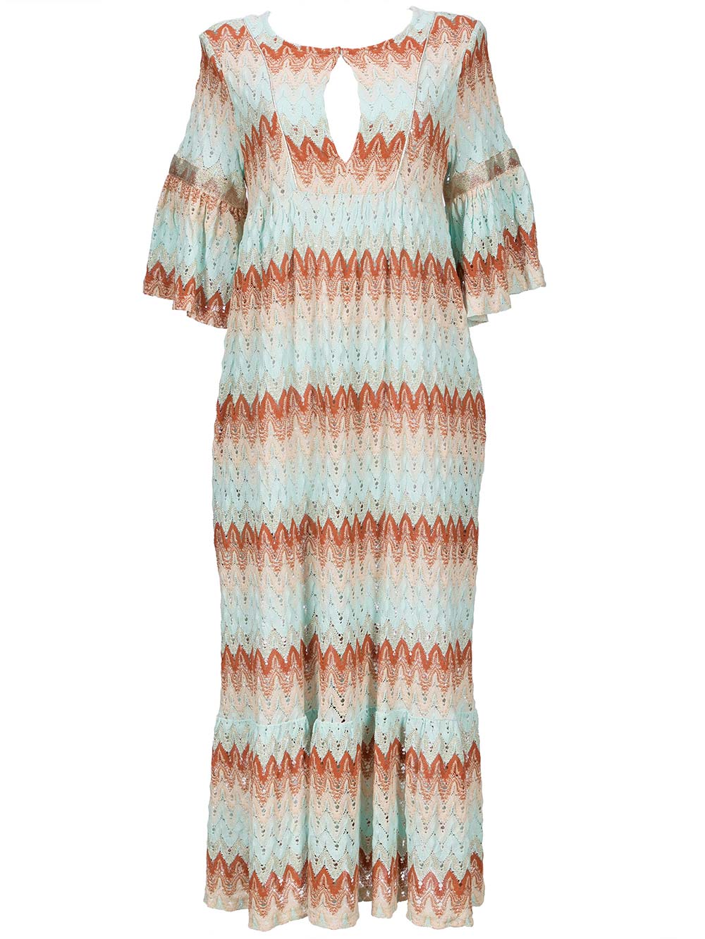 Abito lungo mare/città donna in maglia tricot elegante con lavorazione bloccata a lisca pesce traforata effetto Missoni sui toni dell’acquamarina/beige/ruggine/oro, manica al gomito con forma a ventaglio, bottone sul davanti con scollo a oblò, taglio arricciatura metà seno, tasche laterali invisibili, forma svasata + gala finale.