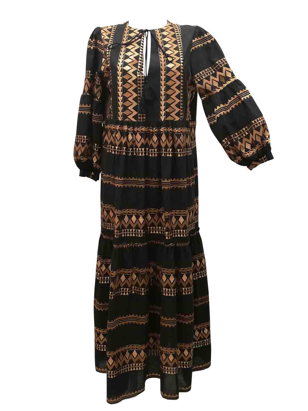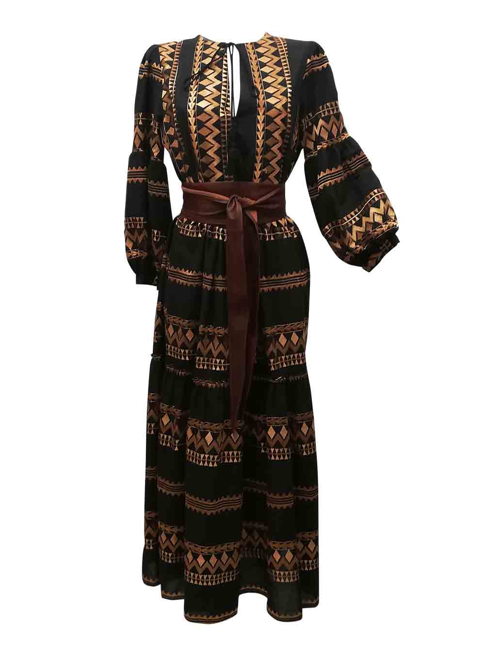 Abito lungo donna gusto veramente originale dalla Grecia, in puro cotone fondo nero con lavorazione/ricamo sul tessuto in filoseta color rame lucido in fantasia con disegni originali di stile greco veramente di grande effetto. Manica lunga con finale arricciato e cinturino da bloccare in alto con effetto a sbuffo, girocollo con apertura fonda più laccetto con nappe, taglio arricciato sotto il seno, parte finale svasata con balza alta che dà ricchezza a tutto l’abito. Il taglio al seno ha una grande vestibilità. Molto bello da indossare con cintura (non inclusa nell’abito).
