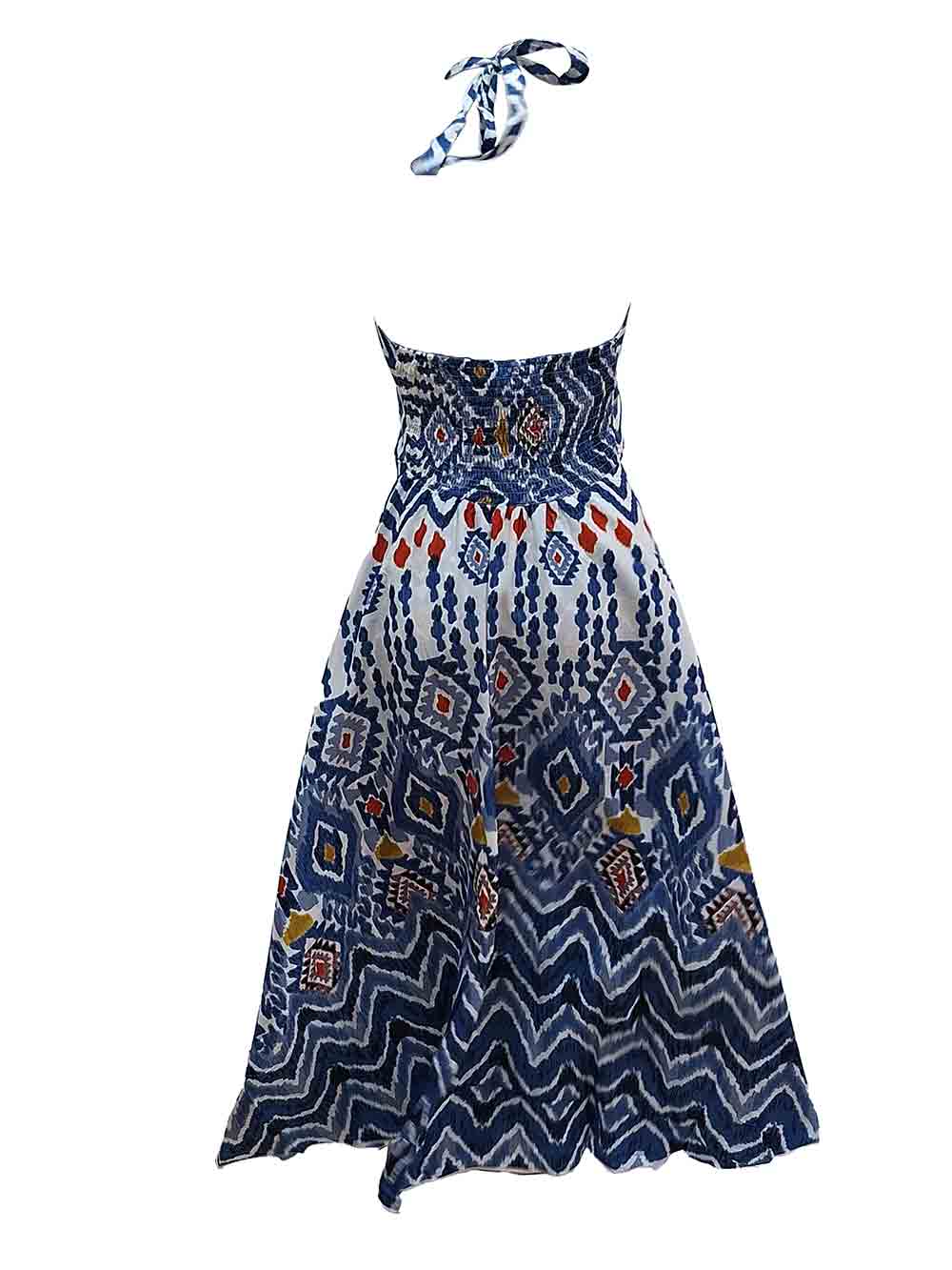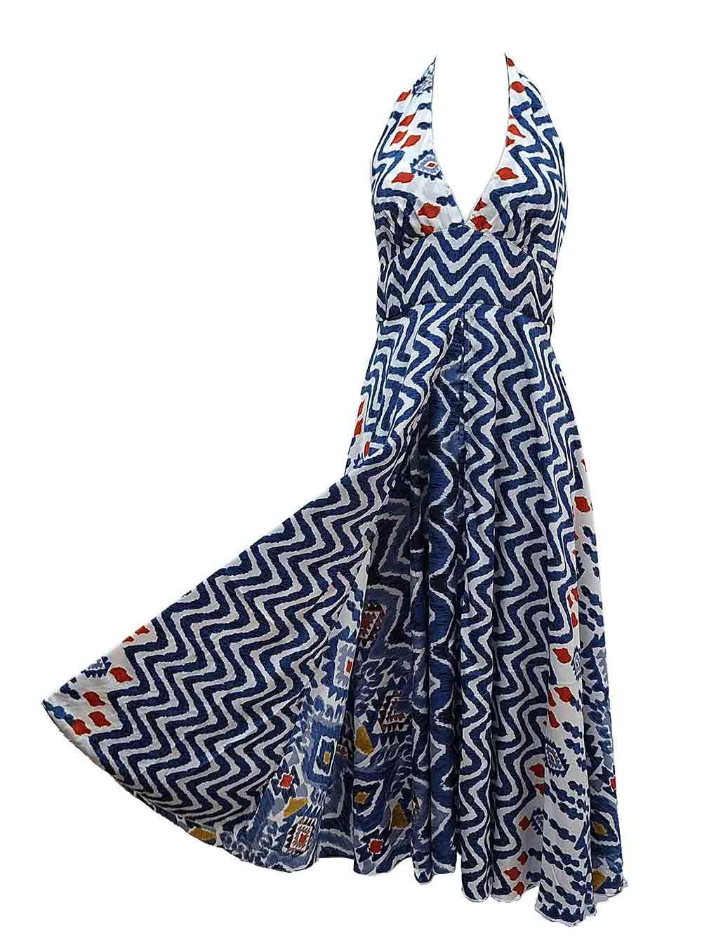 Abito lungo mare/città donna fantasia optical/tribale sui toni del bianco/azzurro/denim/arancio/senape/tabacco in tessuto di microfibra scivoloso e cascante molto fresco, no trasparente, scollo a triangolone sul davanti, allacciato al collo, spalle nude e scoperto sul dietro, con arricciatura sotto il seno per vestibilità, sul davanti ricca fascia di sostegno che finisce sul dietro con una balza alta tutta arricciata che dona vestibilità e respiro, la parte bassa è formata da una doppia gonna a due pannelli: la parte sotto è fissa e svasata, mentre la parte sopra è tutta aperta sul davanti con macro spacco e svasata, lunghezza sotto caviglia.
