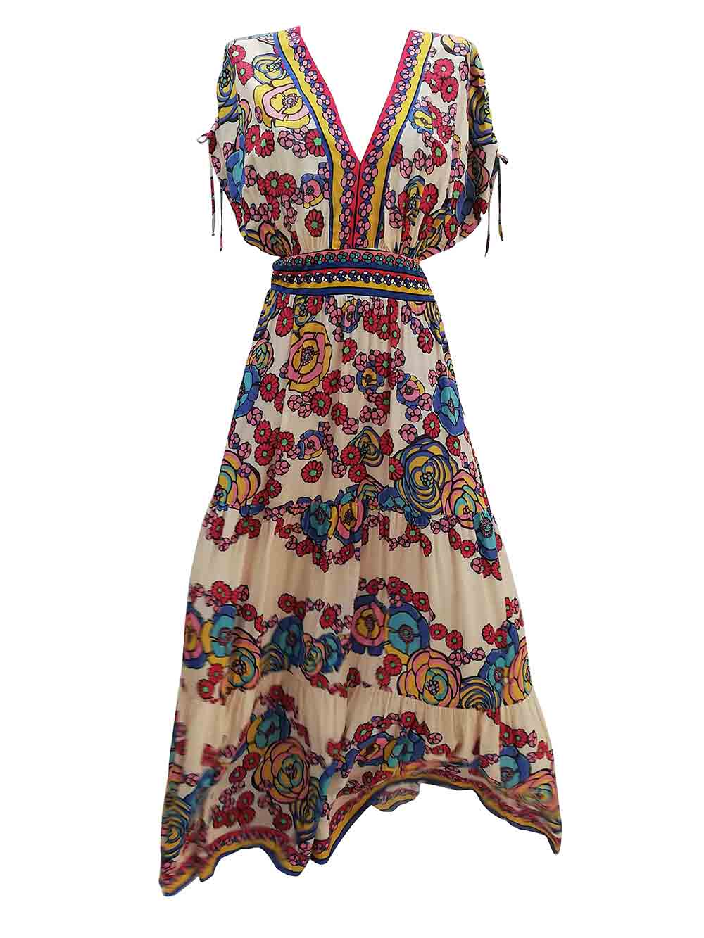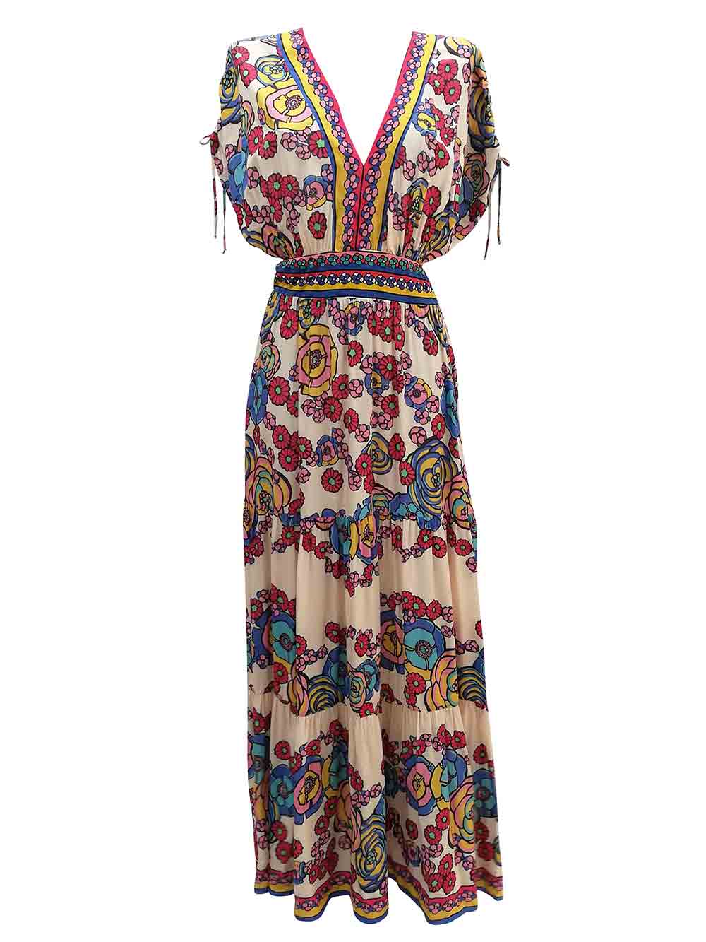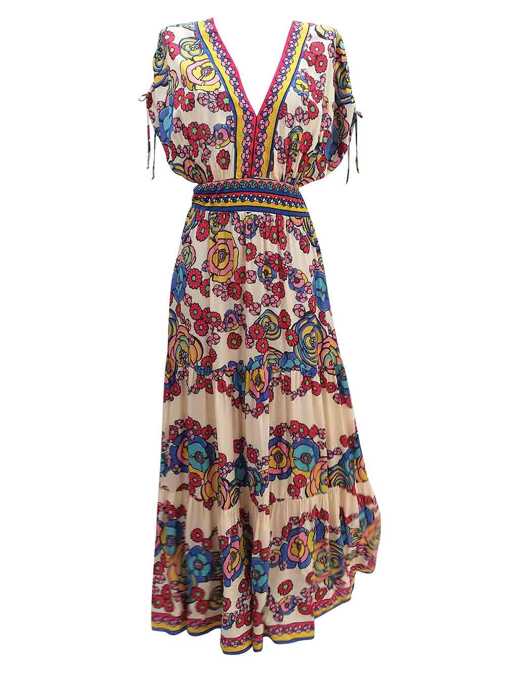 Abito lungo mare/città donna fantasia new floreale sui toni del rosso rubino/giallo/turchese/pervinca/rosa/verde erba/azzurro fondo avorio in leggera e cascante viscosa, scollo a V sul davanti, manichina calata più laccetti regolabili, taglio in vita con fascia alta stampata in jersey elastico che dà più misure, arricciatura sotto il seno, forma ricca e svasata sul fondo con balze/gale arricciate che dà volume finale, lunghezza caviglia.