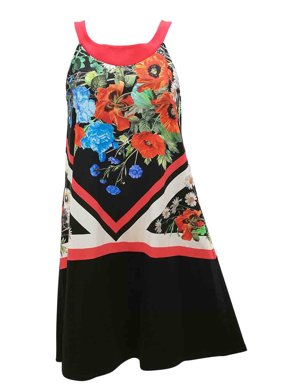 Abitino mare/città donna stampa piazzata esclusiva floreale/geometrica sui toni del rosso/arancio/azzurro/turchese/celeste/verde/panna fondo nero, in jersey leggero, scivoloso e cascante di altà qualità, scollato smanicato simil americano, scollatura rotonda con spalla piatta rigida in colore rosso, forma a trapezio molto svasato sul fondo, balza finale nera unita.