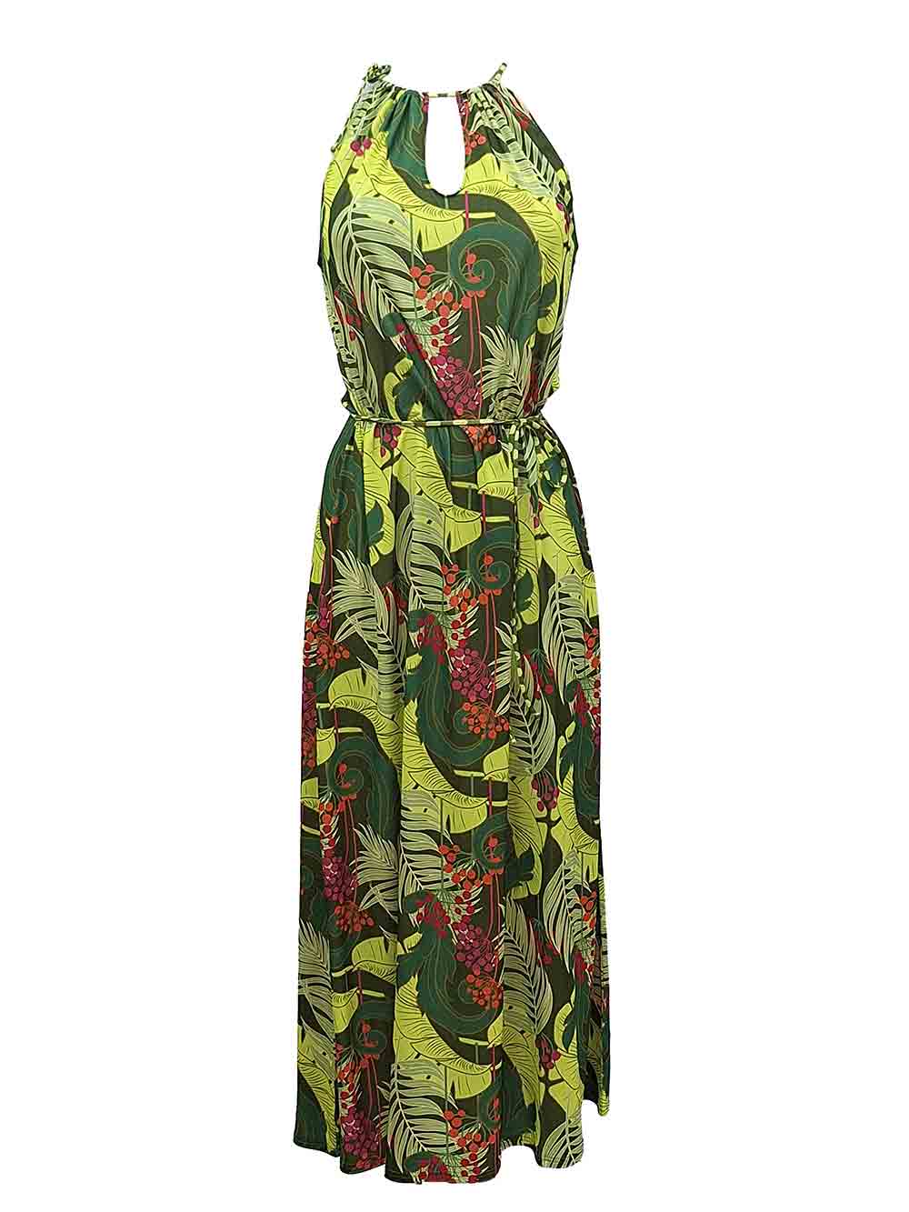 Abito lungo mare/città fantasia giungla/foglie sui toni del verde oliva scuro/verde pino/lime/verde salvia/fucsia/corallo in jersey di microfibra leggero e cascante, lunghezza alla caviglia, forma semi trapezio, laccetto che regola la scollatura più oblò centrale sul davanti.