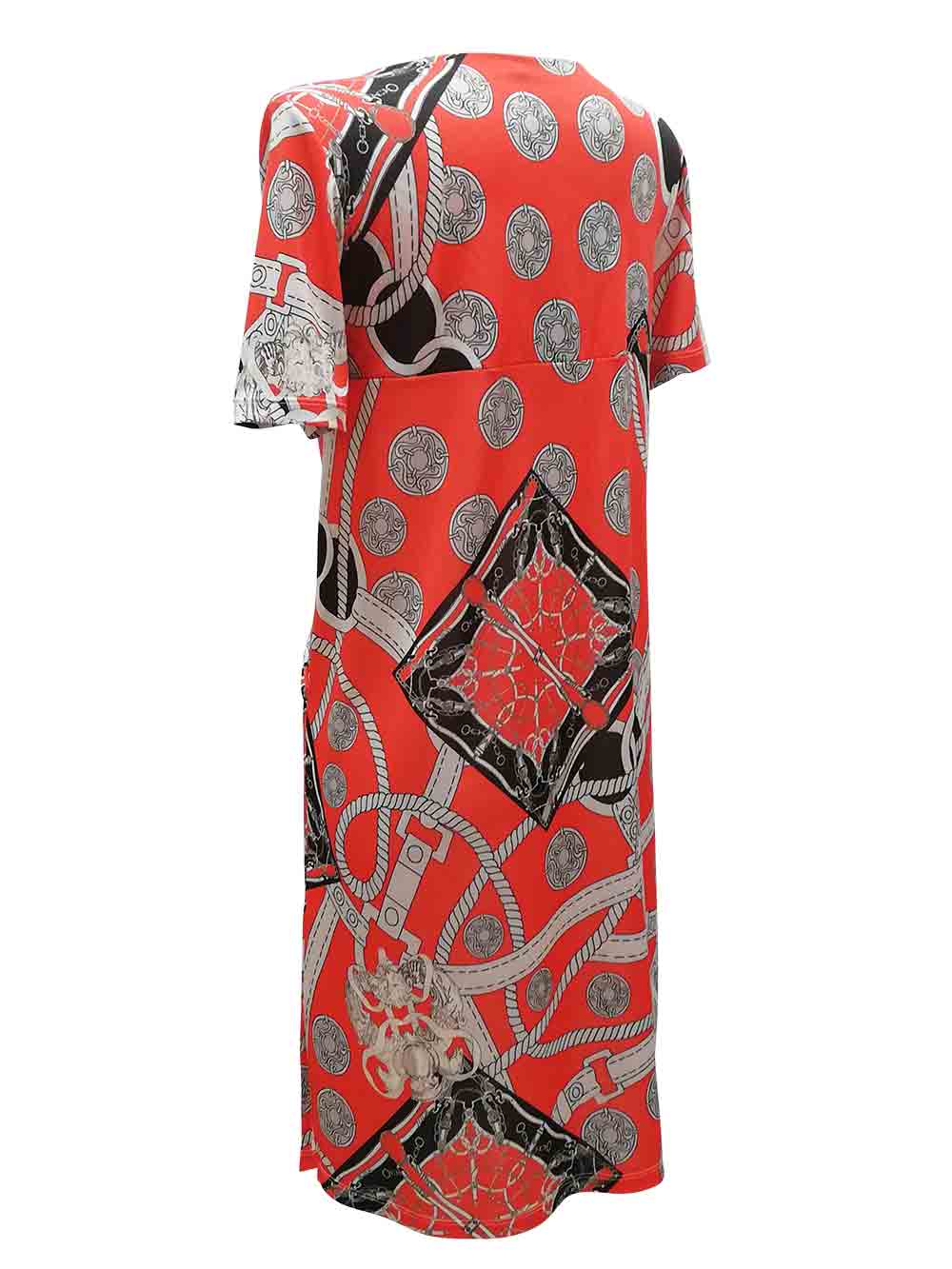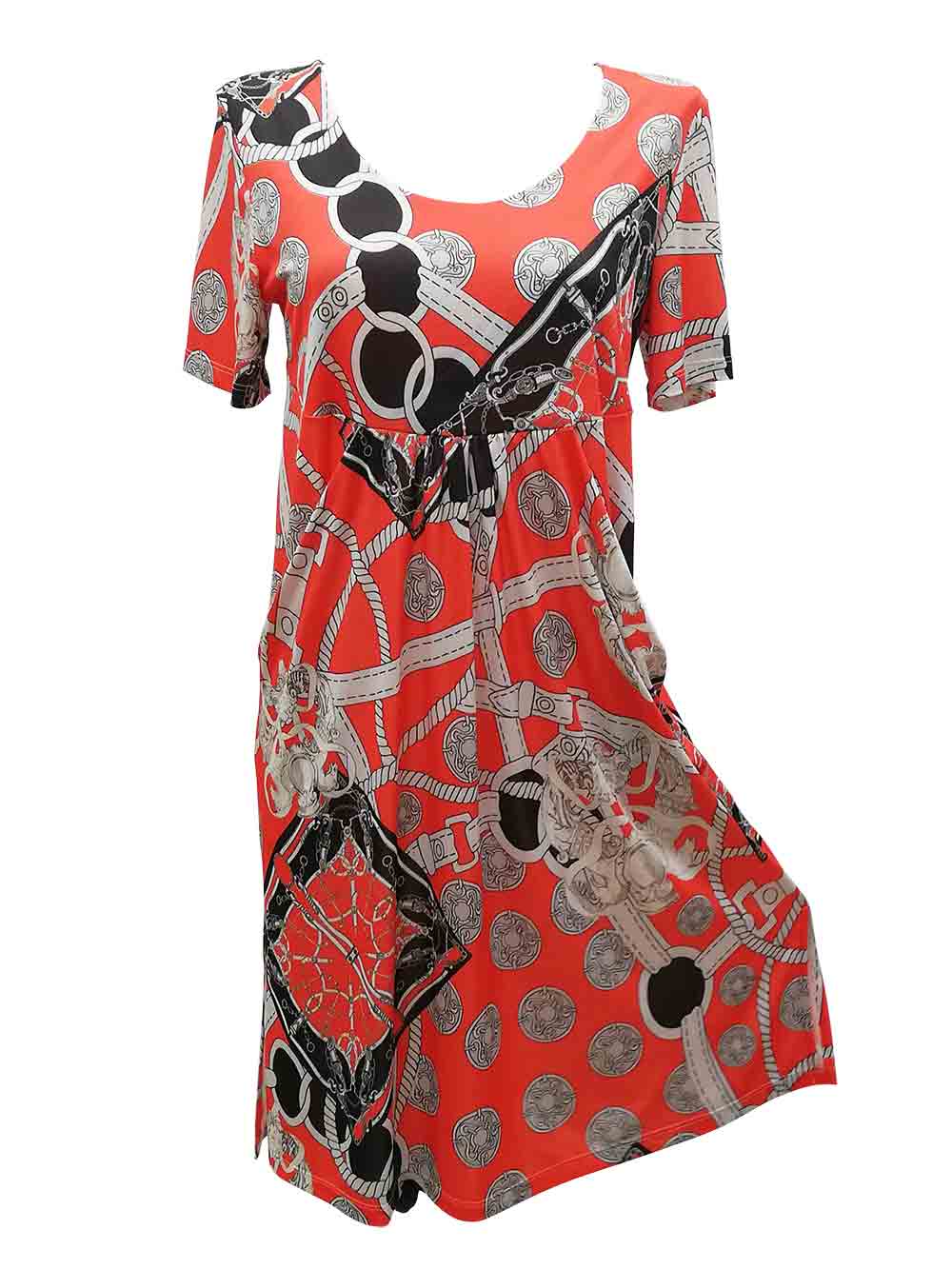Abitino donna città/mare con stampa Hermes sui tondi del bianco/nero/grigio perla fondo rosso corallo in morbidissimo e cascante jersey di viscosa, scollo rotondo a Madonna, mezza manica, parte alta tutta doppiata, sul seno taglio impero morbido per dare bella vestibilità, arricciato sul davanti per mascherare inestetismi, sui laterali tasche a goccia morbide, comodo e scivoloso sul fondo con spacchetti laterali, lunghezza sotto il ginocchio, no trasparenze.