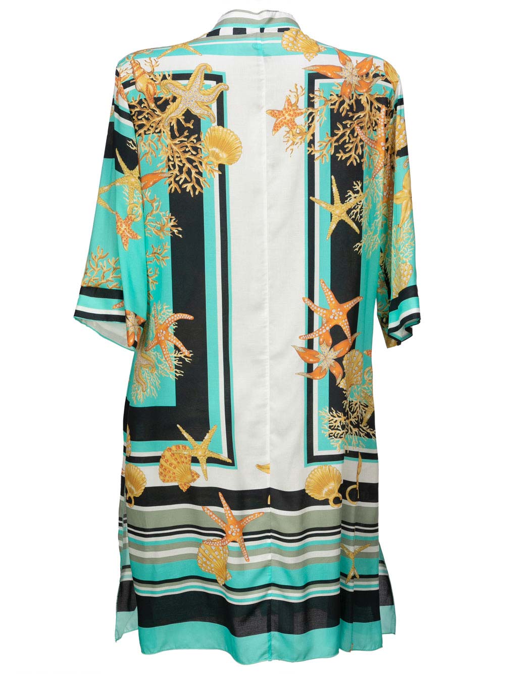 Abito/camicione mare/città donna fantasia quadri stile e stelle marine sui toni del verde menta/nero/bianco/giallo/arancio in viscosa cascante, tutto aperto usl davanti con bottoni a vista fino in fondo, collo coreana, manica al gomito, spacchi laterali.