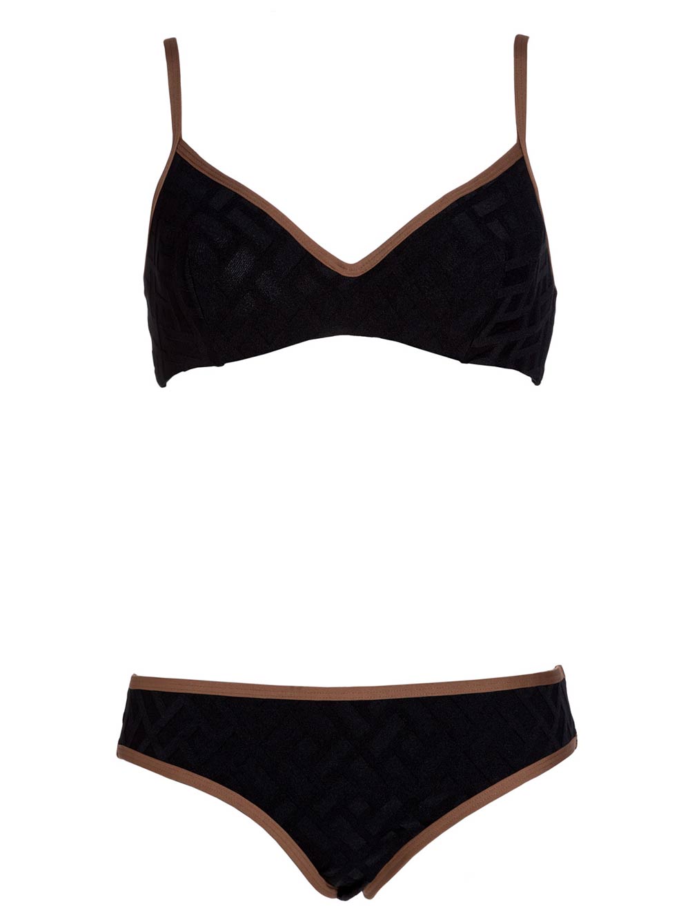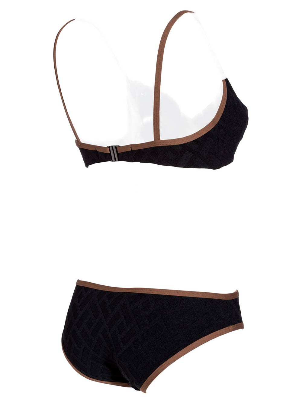 Bikini donna nero, reggiseno con ferretto invisibile, effetto esterno top, spallino fisso al reggiseno, tessuto molto estensibile in lycra con lavorazione geometrica devoré tono su tono, slip medio nero, tutto doppiato, profilato in marrone cioccolato come reggiseno.