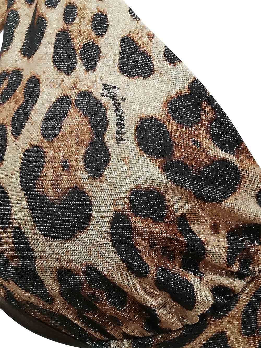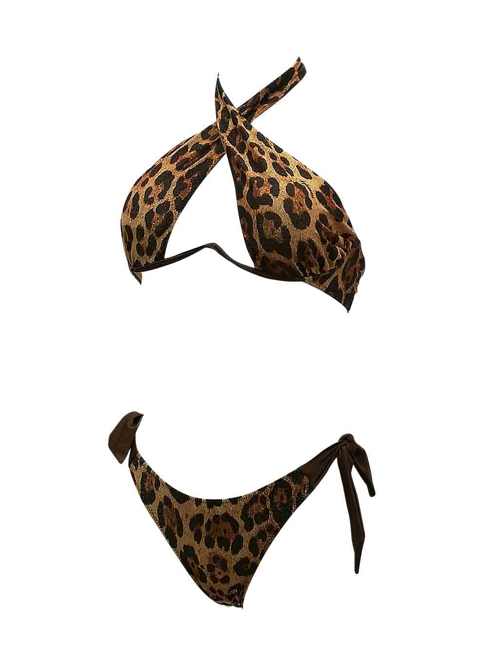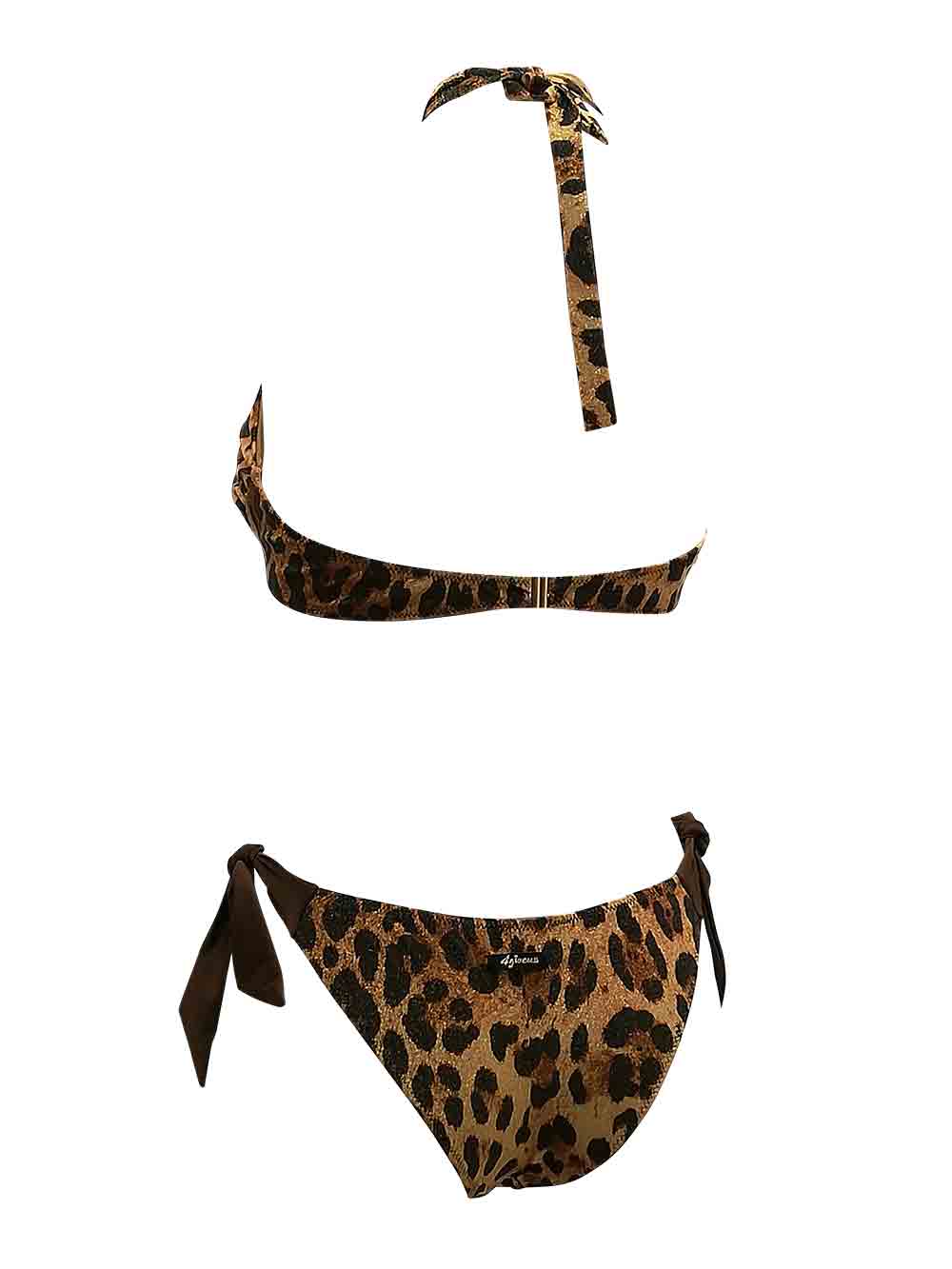 Bikini donna in lycra elasticizzata fantasia animalier sui toni del nero/marrone/caramello più lurex dorato, composto da: reggiseno con forma nuova, ferretto anatomico intero sul davanti, imbottitura estraibile, da indossare con incrocio centrale sul davanti e allacciatura regolabile al collo, chiusura fissa sul retro con gancetto metallico anallergico; slip brasiliano taglio regolare, tutto doppiato, cucitura sul dietro, fiocchi laterali regolabili in colore contrasto marrone.