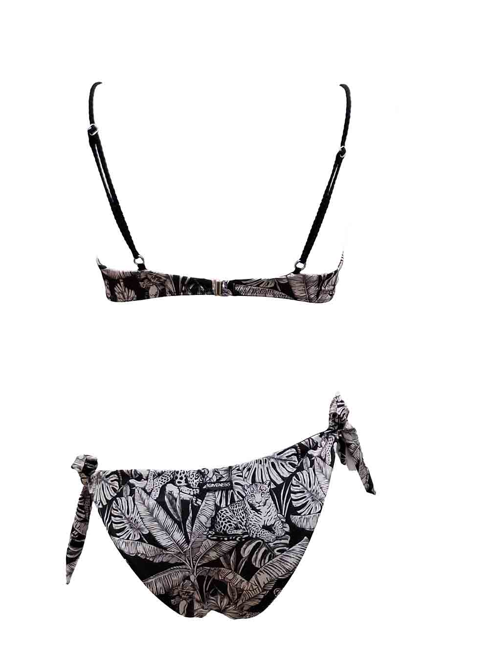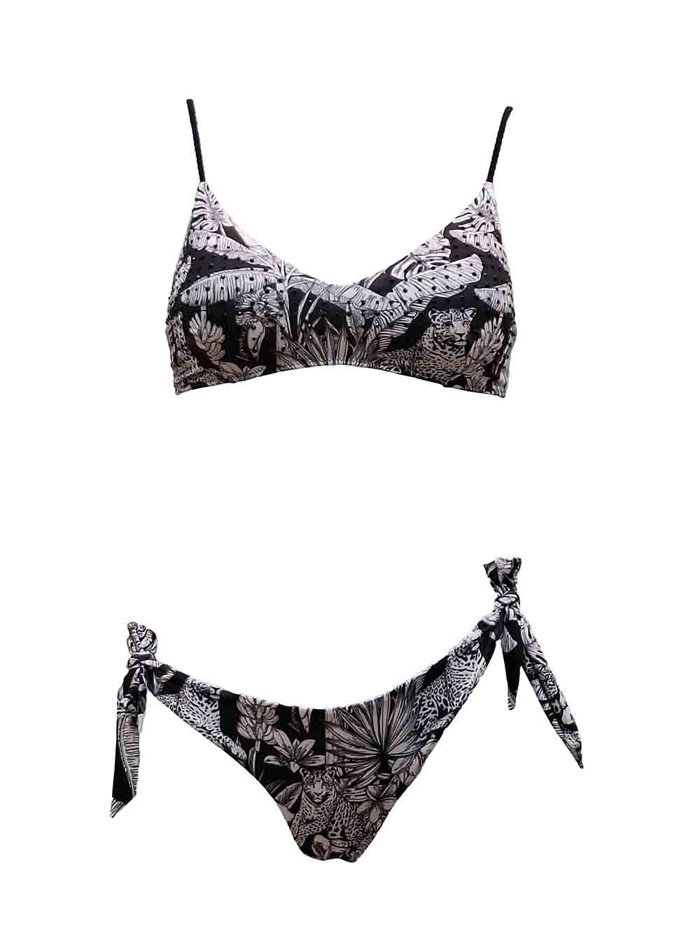 Bikini donna in lycra fantasia animalier/giungla sui toni del nero/bianco/grigio composto da: top brassiere con imbottitura estraibile, su entrambe le coppe borchiette nere luminose, spallini a reggiseno regolabili, allacciatura sul dietro fissa con gancetto metallico anallergico; slip con fiocchi regolabili sui fianchi, forma slip semi regolare, reversibile (parte esterna fantasia animalier, parte interna in nero unito), cuciture invisibili, no taglio.