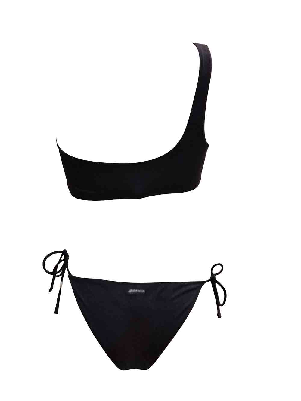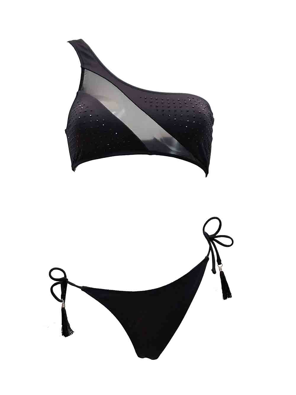 Bikini donna in lycra nera unita composto da: top a brassiere monospalla non imbottito (anche esternabile), parte centrale inserto ad onda in toulle semi trasparente, coppe laterali doppiate in lycra più borchiette luminose su tono, parte dietro con scollatura asimmetrica alta (no ganci), slip con laccetti regolabili sui fianchi più nappe, forma a brasiliano con taglio centrale sul dietro, tutta doppiata.