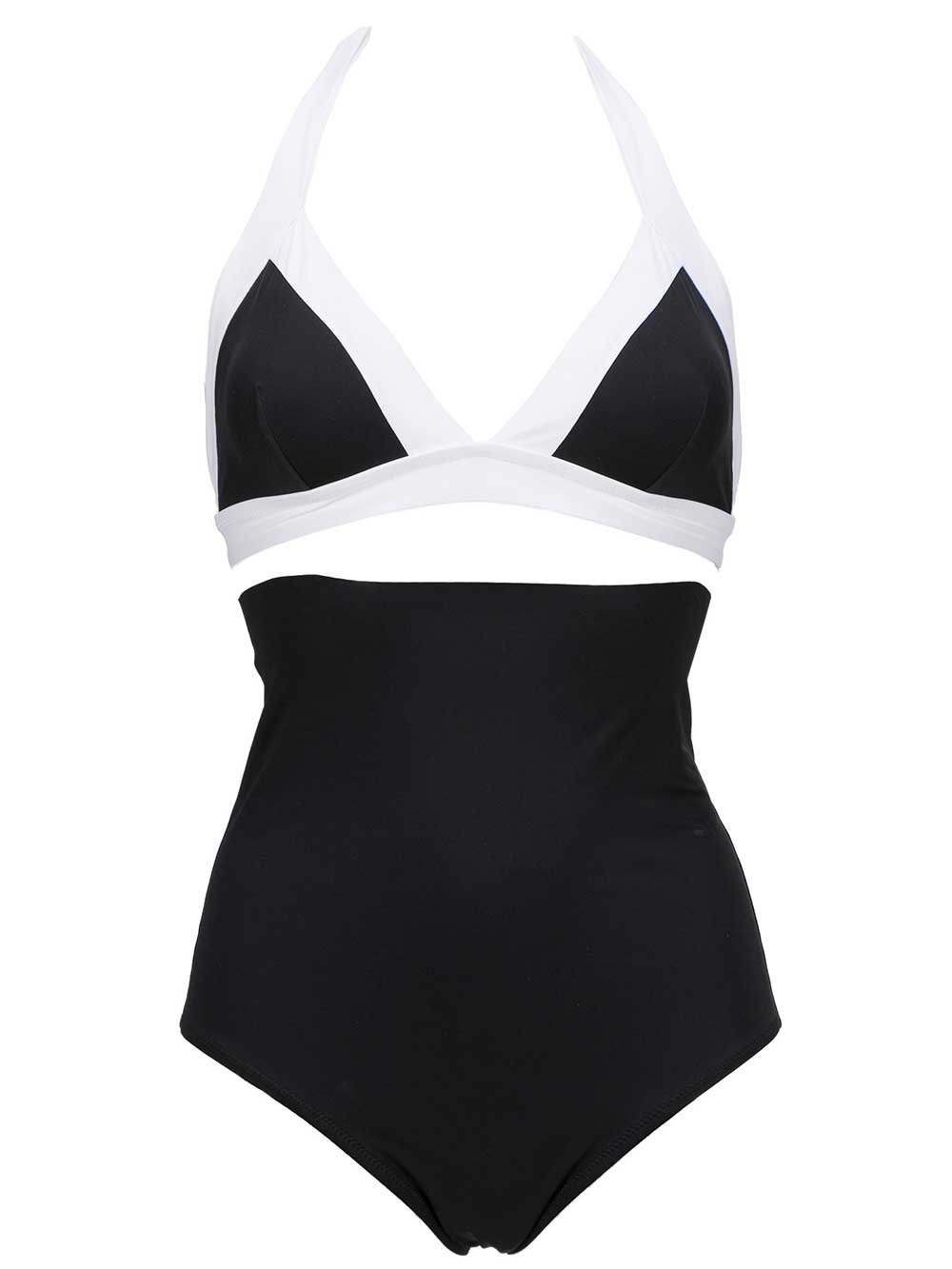 Bikini donna bicolor bianconero in morbida lycra stretch tecnica opaca composto da: triangolo fisso con coppa interna nera, tutto profilato in bianco, allacciatura regolabile al collo, fascia/laccetto fissa sul dietro con gancetto metallico anallergico; slip moda molto alto modello shaper/riducente, taglio laser sulla parte alta del torace.