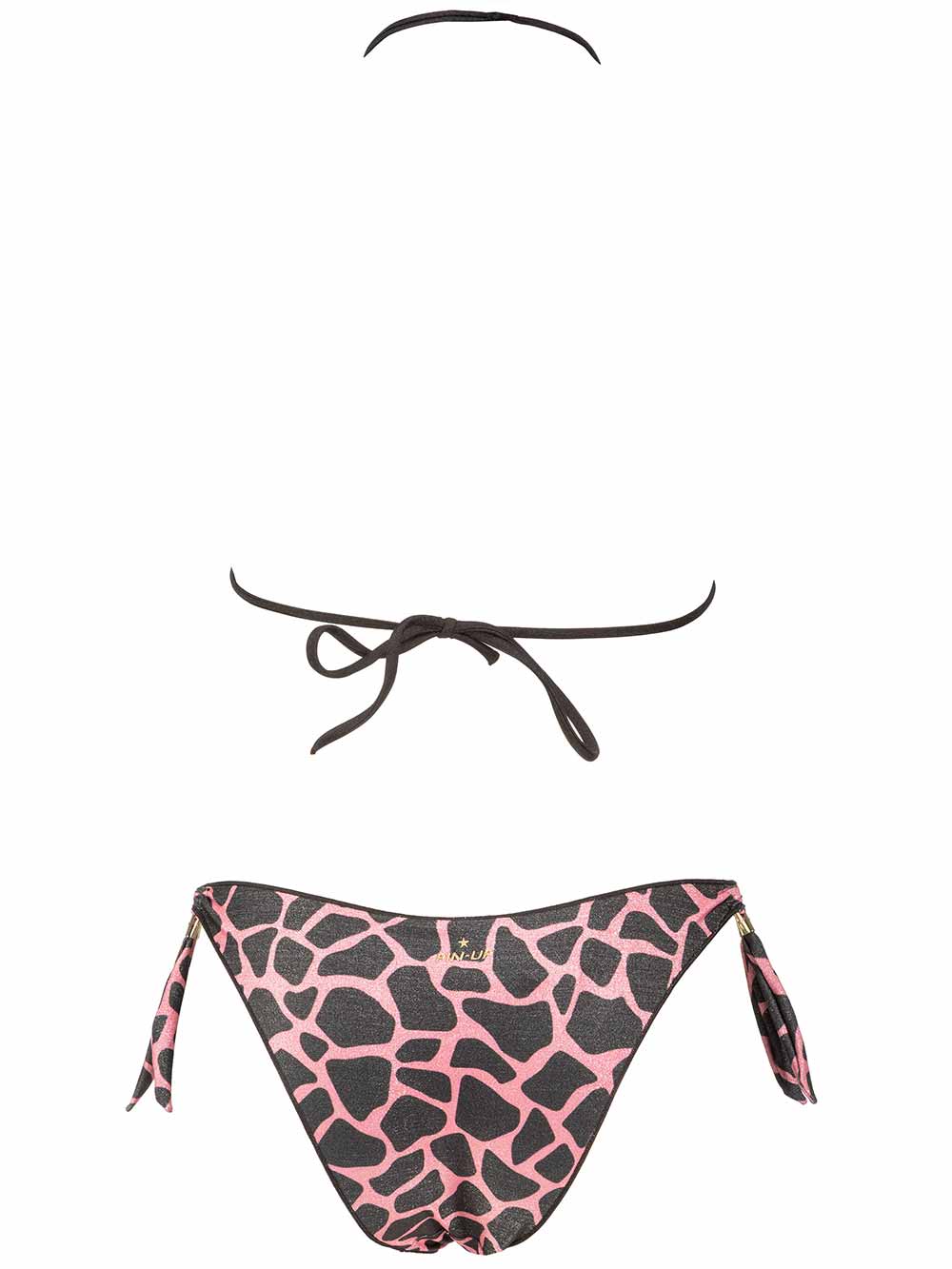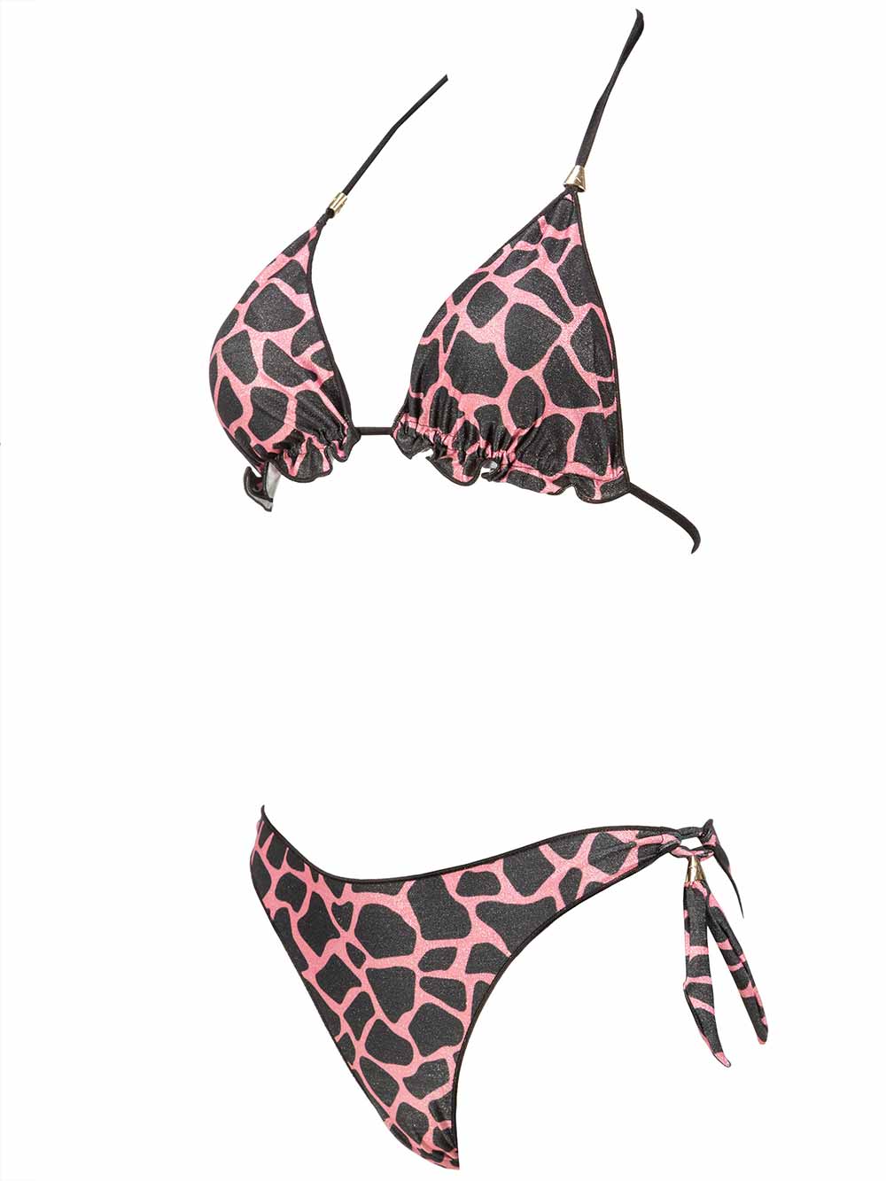Bikini donna fantasia animalier giraffato sui toni del nero/rosa intenso + lurex in lycra elasticizzata composto da: reggiseno a triangolo a scorrere con imbottitura estraibile + microvoulant finale, microgioiello metallico anallergico sul finale della coppa, allacciatura al collo e dietro regolabili; slip basic aperto e regolabile sui fianchi con laccetti + microiello metallico anallergico.