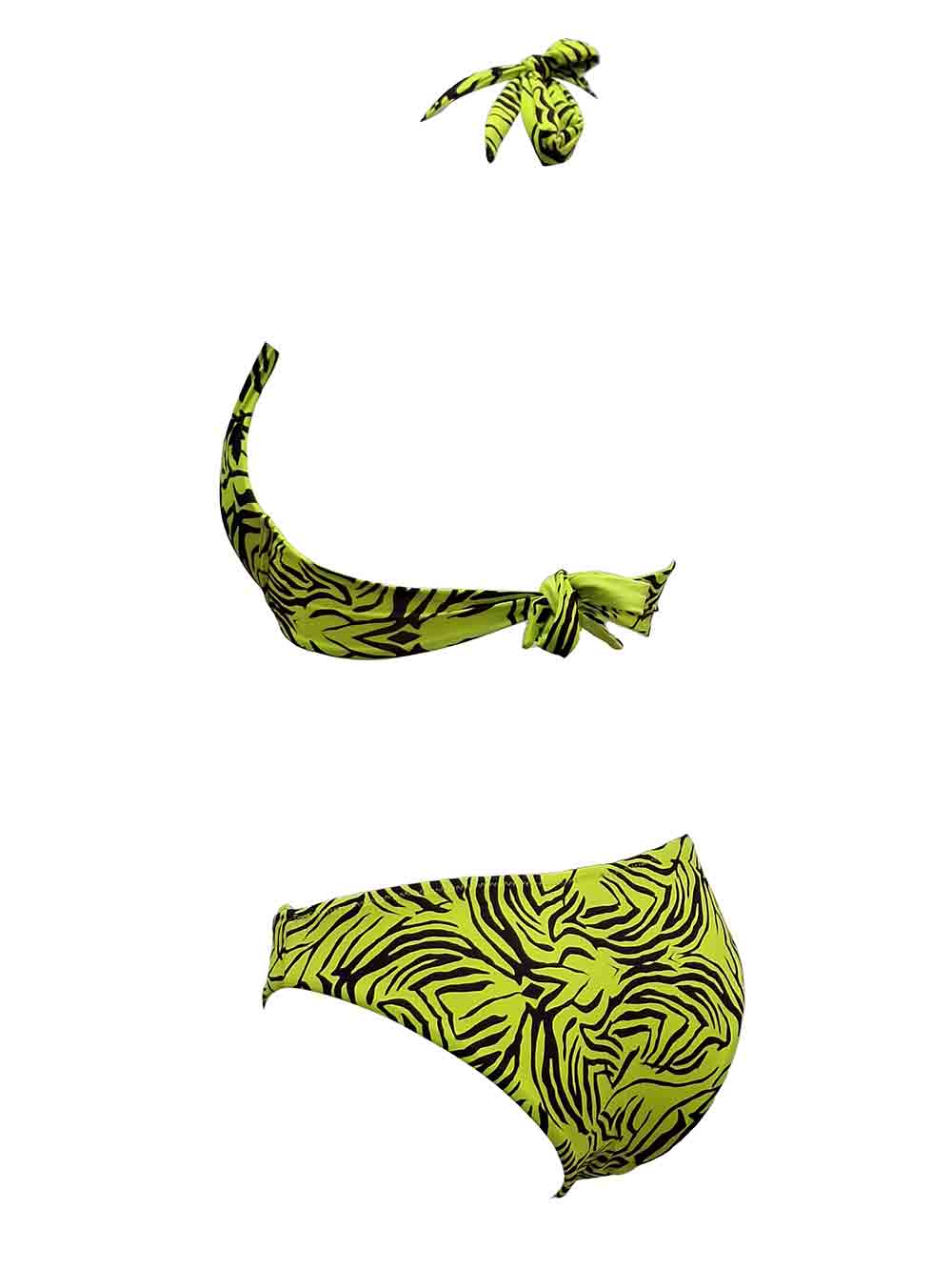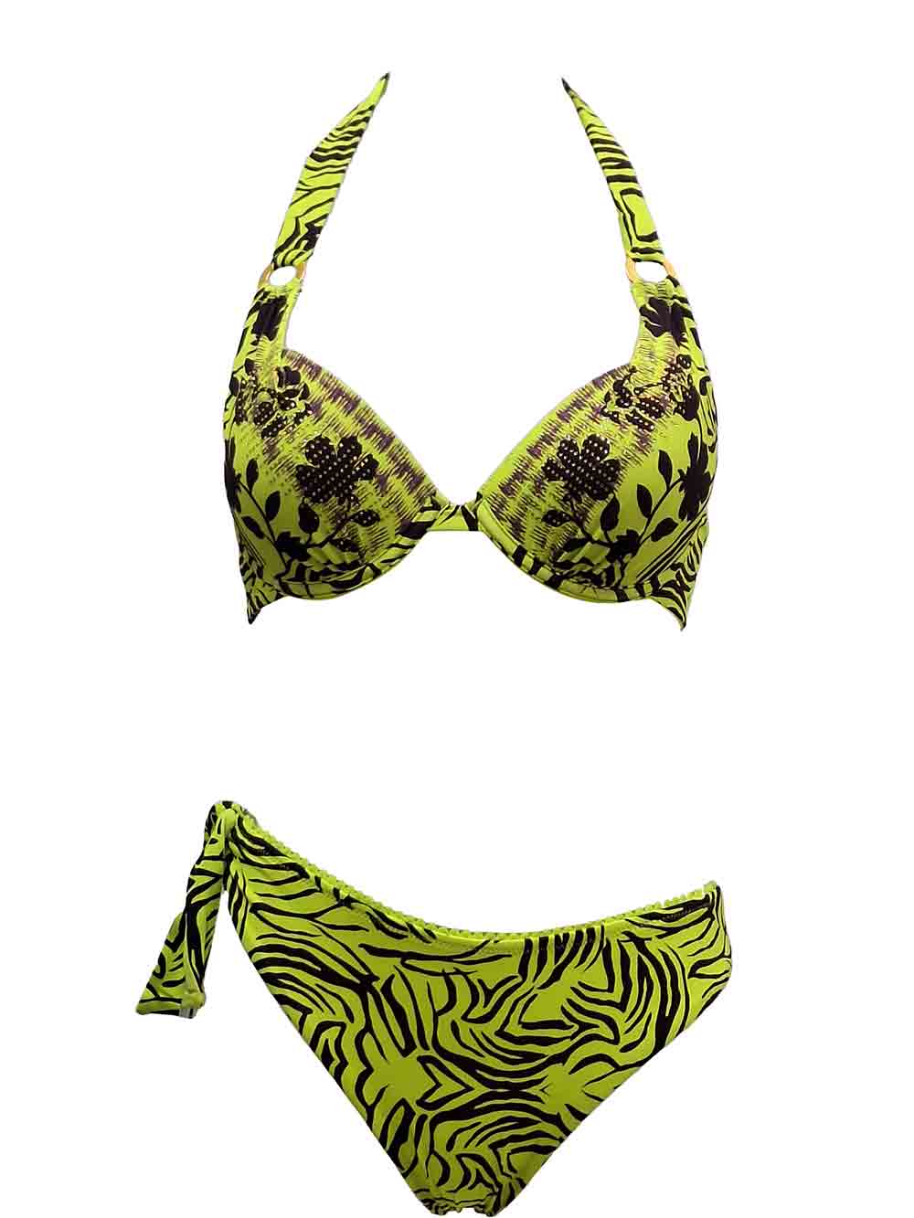 Bikini donna fondo verde acido brillante con stampa animalier/floreale sui toni del marrone scurissimo in morbida e leggera lycra opaca, tutto doppiato, composto da: reggiseno push-up con imbottitura preformata più pesciolino estraibile, allacciatura al collo con fascia larga regolabile che parte dalla coppa più anelli gioiello in metallo dorato, sullo scollo applicazione di microstrass luminosi sul verde acido, allacciatura sul dietro con fascia regolabile (no segno). Slip altezza media (4-5 cm) fisso più fiocchetto amovibile che regola verso il basso, leggermente sgambato, ma regolabile, copertura regolare/moda sul davanti e sul dietro.
