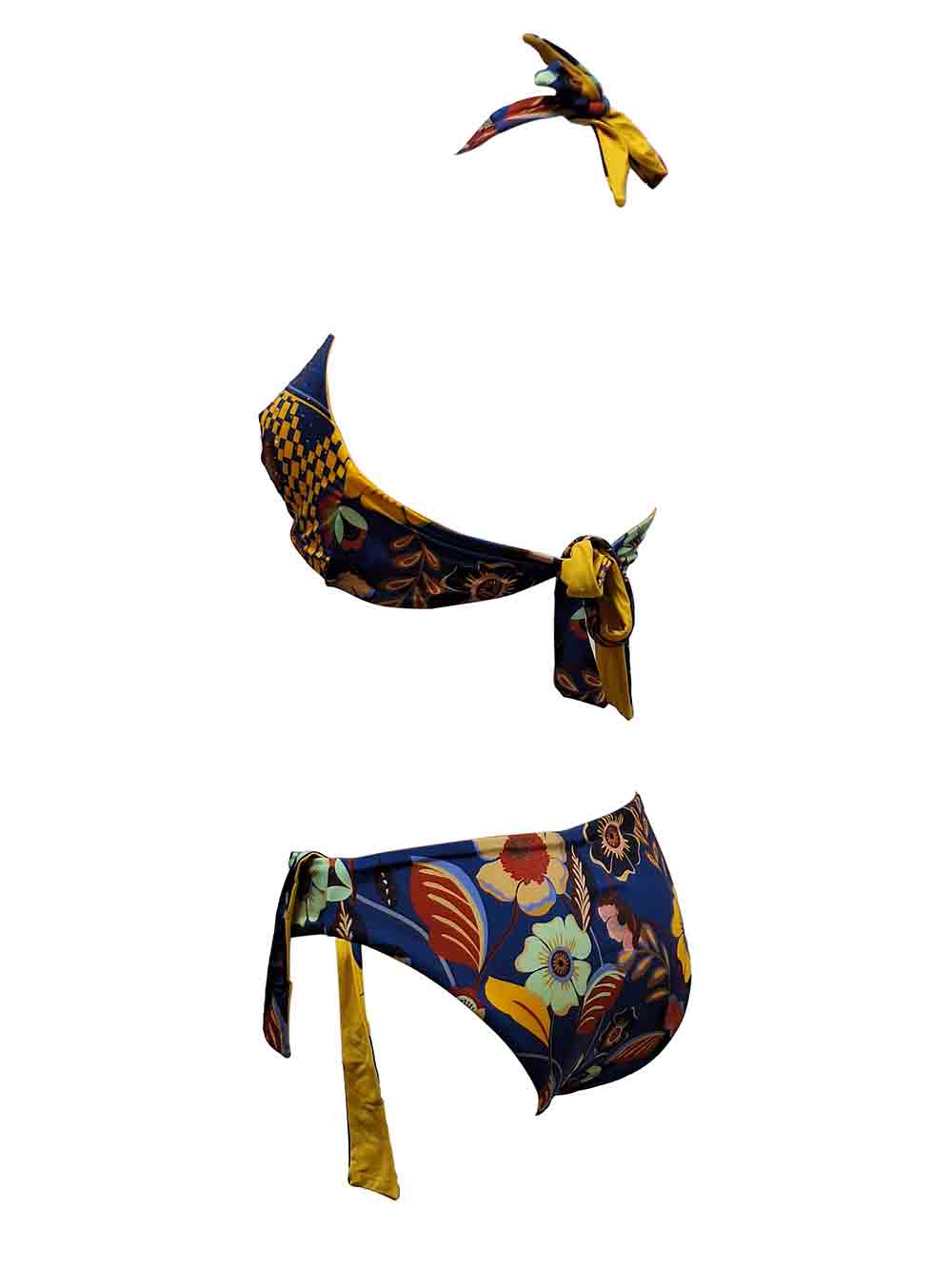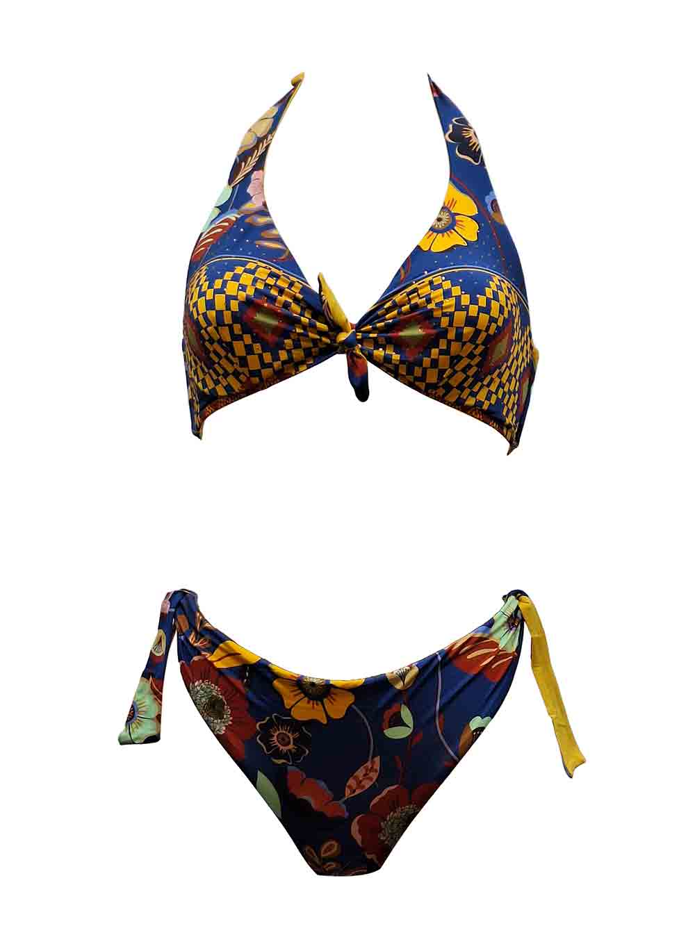 Bikini donna multistampa anni ’80 (parte alta floreale, parte bassa geometrica) fondo blu chiaro con fantasia sui toni del rosso mattone/giallo caldo/nero/azzurro/caramello/ruggine/verde menta/beige in morbida e leggera lycra opaca, tutto doppiato, composto da: reggiseno con ferretto forma a goccia con coppa molto capiente (vestibilità anche coppa C-D), alto sul davanti (6 cm) più laccetto che regola altezza, su tutta la coppa applicazione di microstrass luminosi sui toni del giallo, allacciatura al collo con fascia larga regolabile, allacciatura sul dietro con fascia alta steccata laterale (no segno). Slip fisso altezza media (4-5 cm) più fiocchetto amovibile che regola verso il basso, molto morbido, cuciture invisibili no segno, tutto floreale resersibile in giallo caldo unito.