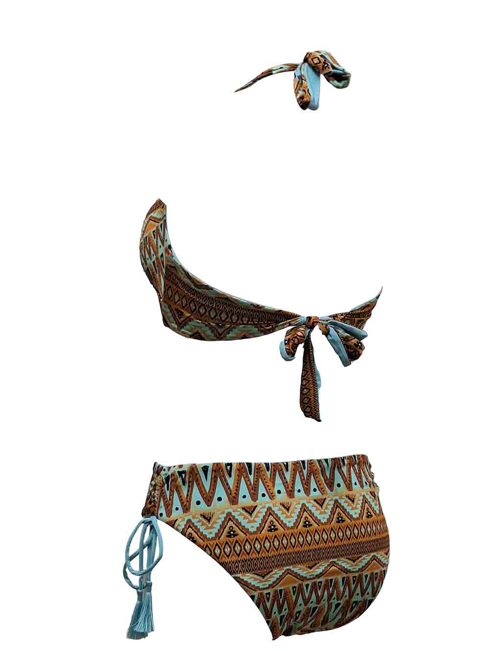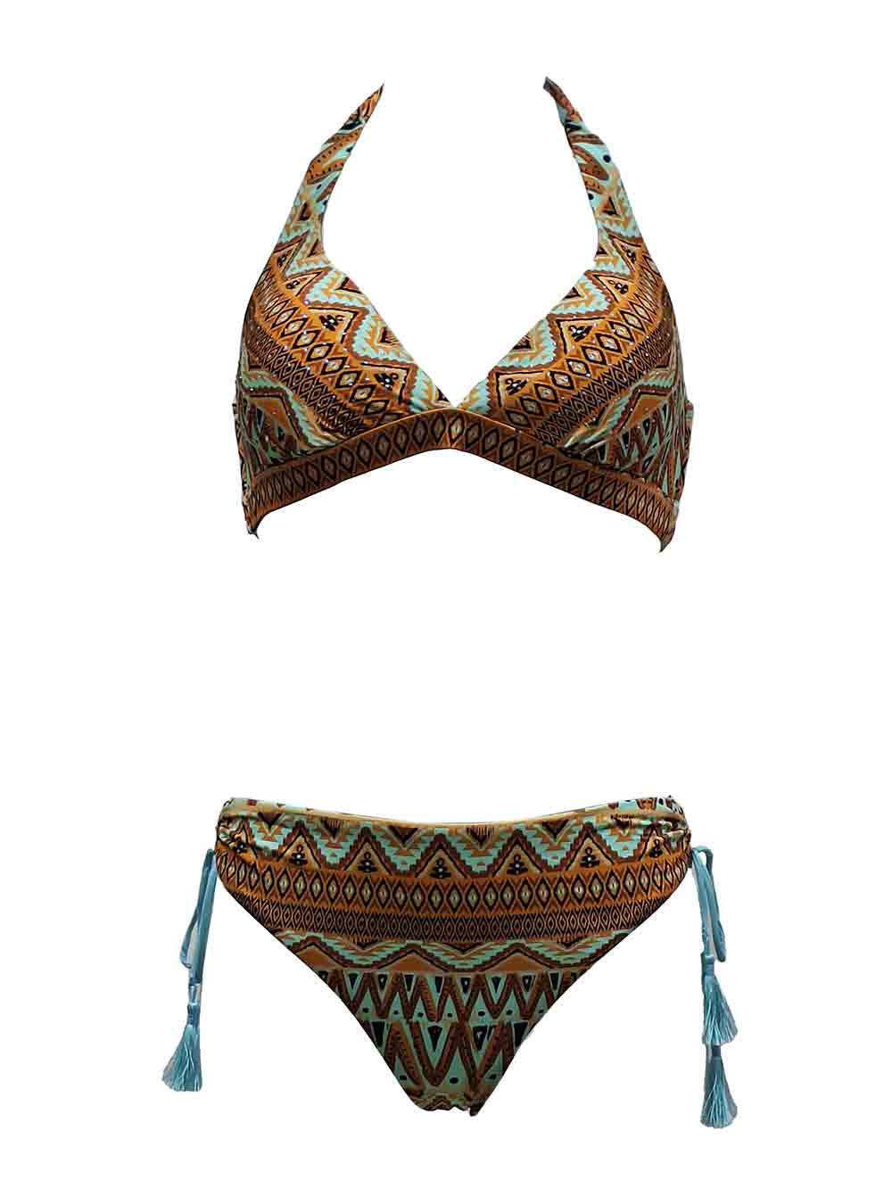 Bikini donna stampa stile Indios sui toni dell’acquamarina/tabacco/beige/caramello/nero in morbida e leggera lycra opaca, tutto doppiato, composto da: reggiseno a triangolo fisso, forma scollo a cuore, imbottitura interna estraibile, modello coprente, sulla coppa applicazione di microstrass luminosi color acquamarina, fascetta fissa sul fondo a contenzione, allacciatura al collo con fascia larga regolabile, allacciatura sul dietro con fascia alta steccata laterale (no segno). Slip altezza media (6 cm) regolabile sui fianchi con laccetto coulisse sui toni dell’acquamarina più nappe, molto morbido, no segno, tutto doppiato con cuciture invisibili.