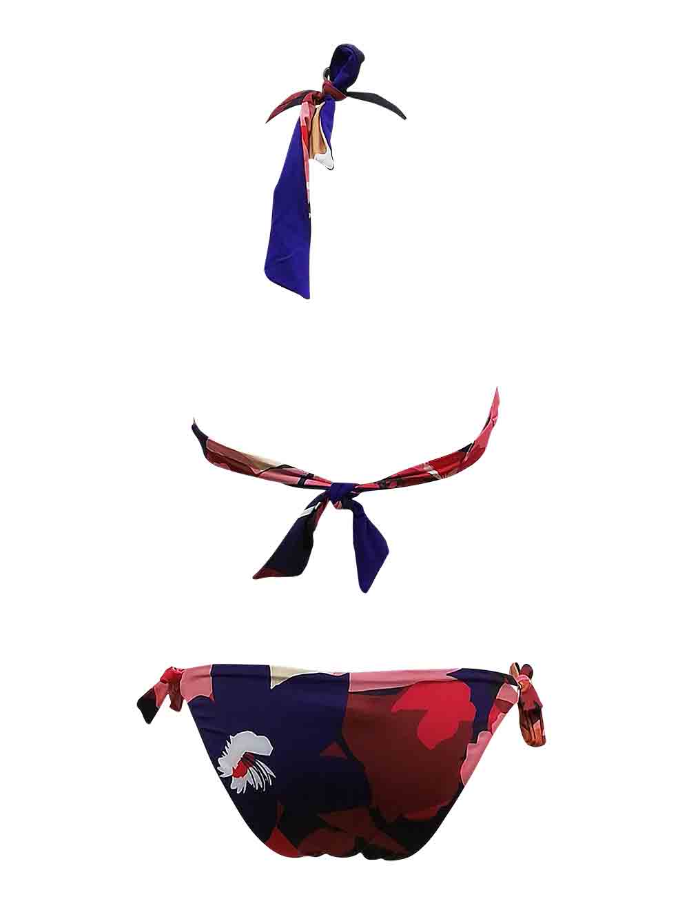 Bikini donna fantasia astratta sui toni del rosa confetto/rosa cipria/viola/rosso fegato/melanzana/beige, in morbida lycra elasticizzata, composto da: triangolone forma a coda laterale per dare maggiore copertura, imbottitura estraibile, scollatura profonda più fascia di sostegno sotto coppa, allacciatura al collo con laccetto morbido regolabile, come sul dietro con fascetta regolabile; slip taglio basic, doppiato, reversibile fantasia/viola unito, laccetti regolabili sui fianchi, no cuciture, no taglio.