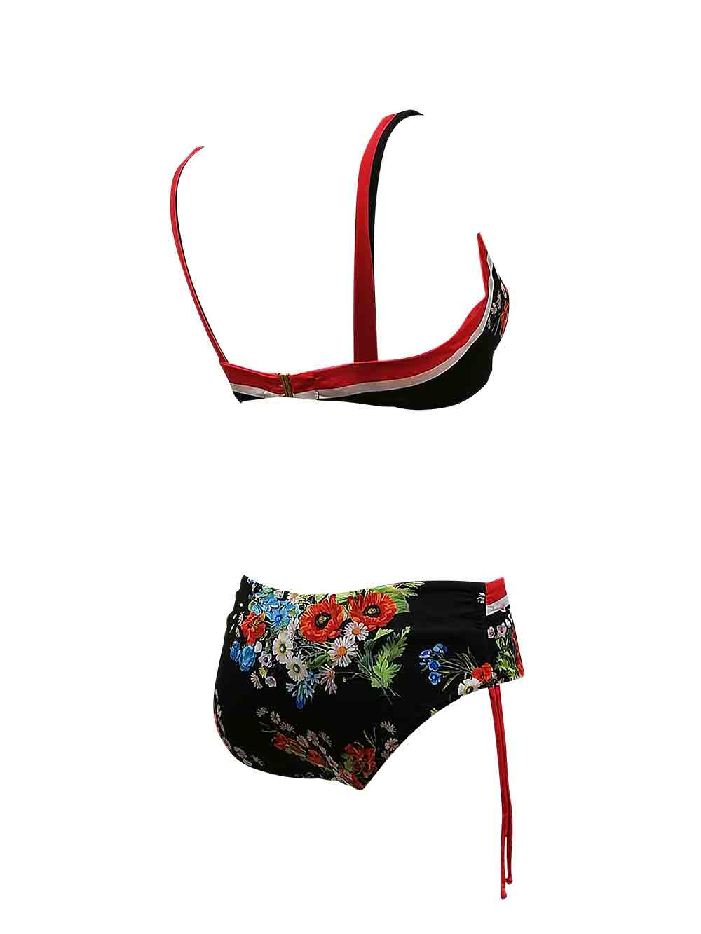Bikini donna fantasia floreale in stampa piazzata fondo nero sui toni del bianco/rosso/verde/celeste/azzurro/arancio/rosa chiaro in morbida lycra opaca composto da: reggiseno con ferretto interno invisibile, forma a goccia, spalla larga confort fissa sul dietro, sul retro agganciatura fissa in metallo anallergico, le coppe sul davanti hanno una stampa piazzata con fiori più profili geometrici sui toni del rosso vivo/bianco; slip medio/alto altezza laterale 9 cm, laccetti sui fianchi con arricciatura che regolano a piacere l’altezza, tutto doppiato, no trasparenze, cuciture invisibili, no taglio, stampa floreale sul davanti e sul dietro più profili sui toni del rosso vivo/bianco.