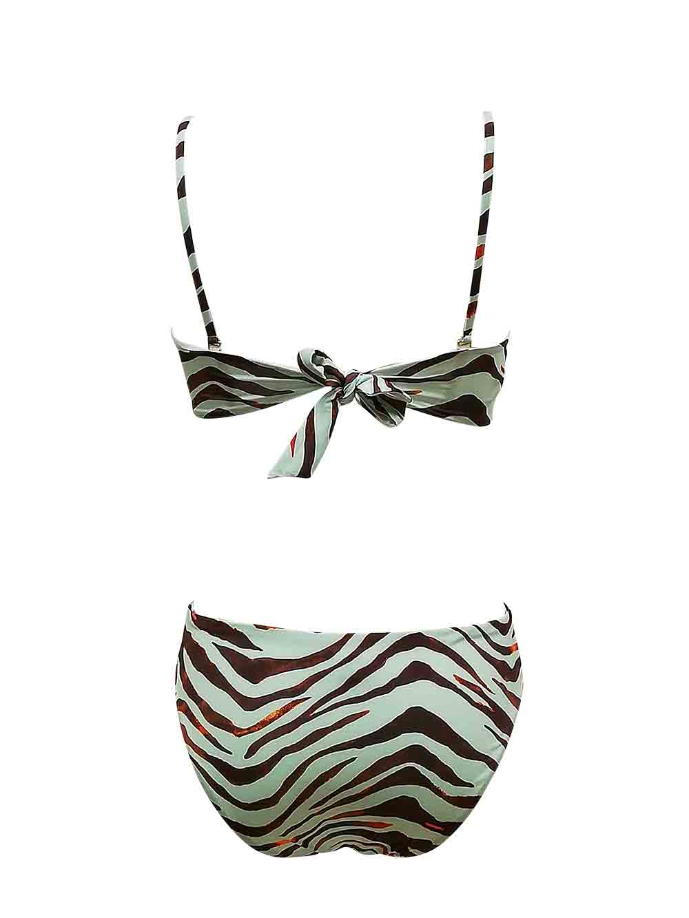 Bikini donna fantasia new animalier sui toni del verde menta/marrone cioccolato/tabacco/arancio in morbida lycra opaca composto da: reggiseno a fascia con ferretto interno invisibile che delinea molto bene il seno, con imbottitura estraibile, stecca laterale anti arricciatura, spallini amovibili, allacciatura sul dietro regolabile, sul davanti applicazione di spighetta in cotone con frange sui toni del menta/lurex dorè; slip medio altezza laterale 6 cm, taglio