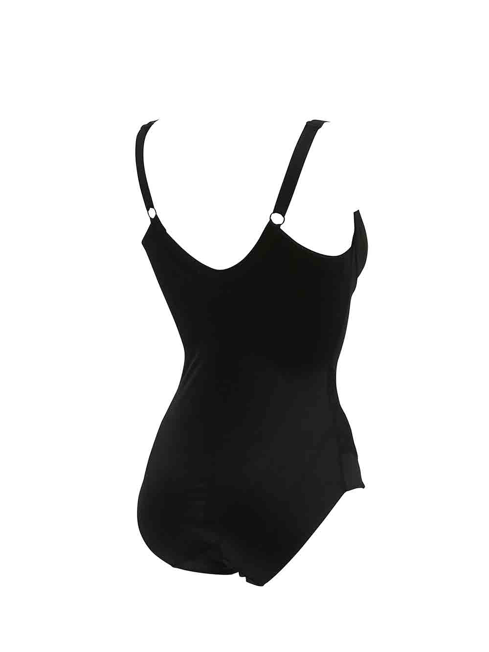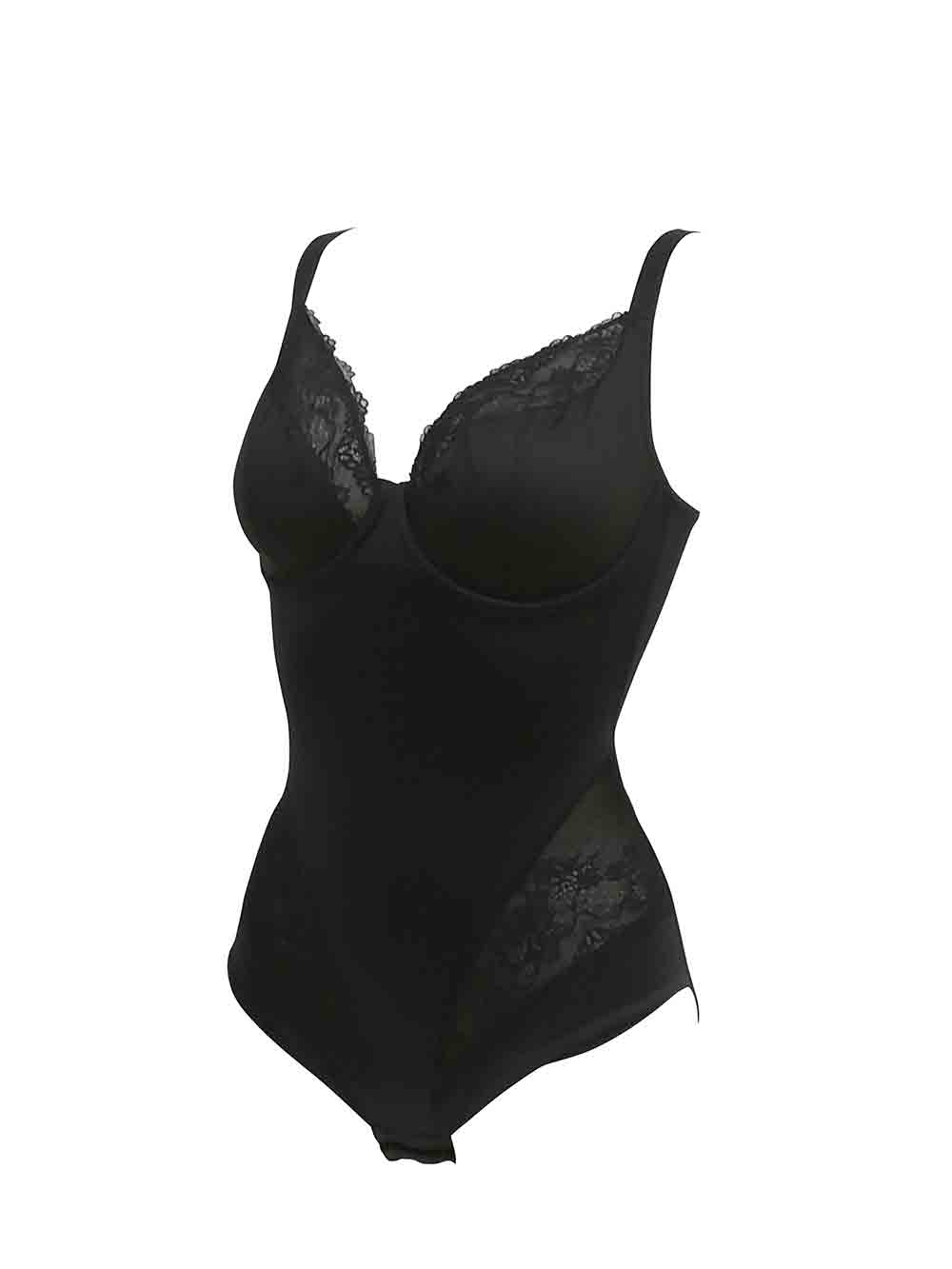 Body donna color nero in lycra tecnica stringente, taglio modellante, compressione media, doppiata internamente tutta la parte davanti con toulle tecnico da alta corsetteria di media compressione, forma del reggiseno ferretto a balconette più pizzo foderato sulla scollatura del reggiseno, spallino più laterale con elastico medio comodo e regolabile, parte bassa slip con forma lady regolare semi sgambata, cuciture finali tutte doppiate a pulito, quindi invisibili, sui laterali del fondo slip inserti in pizzo foderati sempre modellanti.