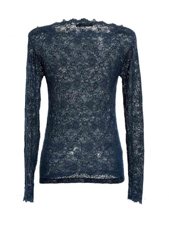 Body sottogiacca nero donna in bitessuto toulle/pizzo motivo floreale, modello a lupetto. Tutta la parte davanti, dietro, e del collo sono in pizzo nero. Le maniche lunghe e tutta parte alta del dietro con modello scollo goccia sono in toulle nero. Bottone unito sul dietro a chiusura collo.