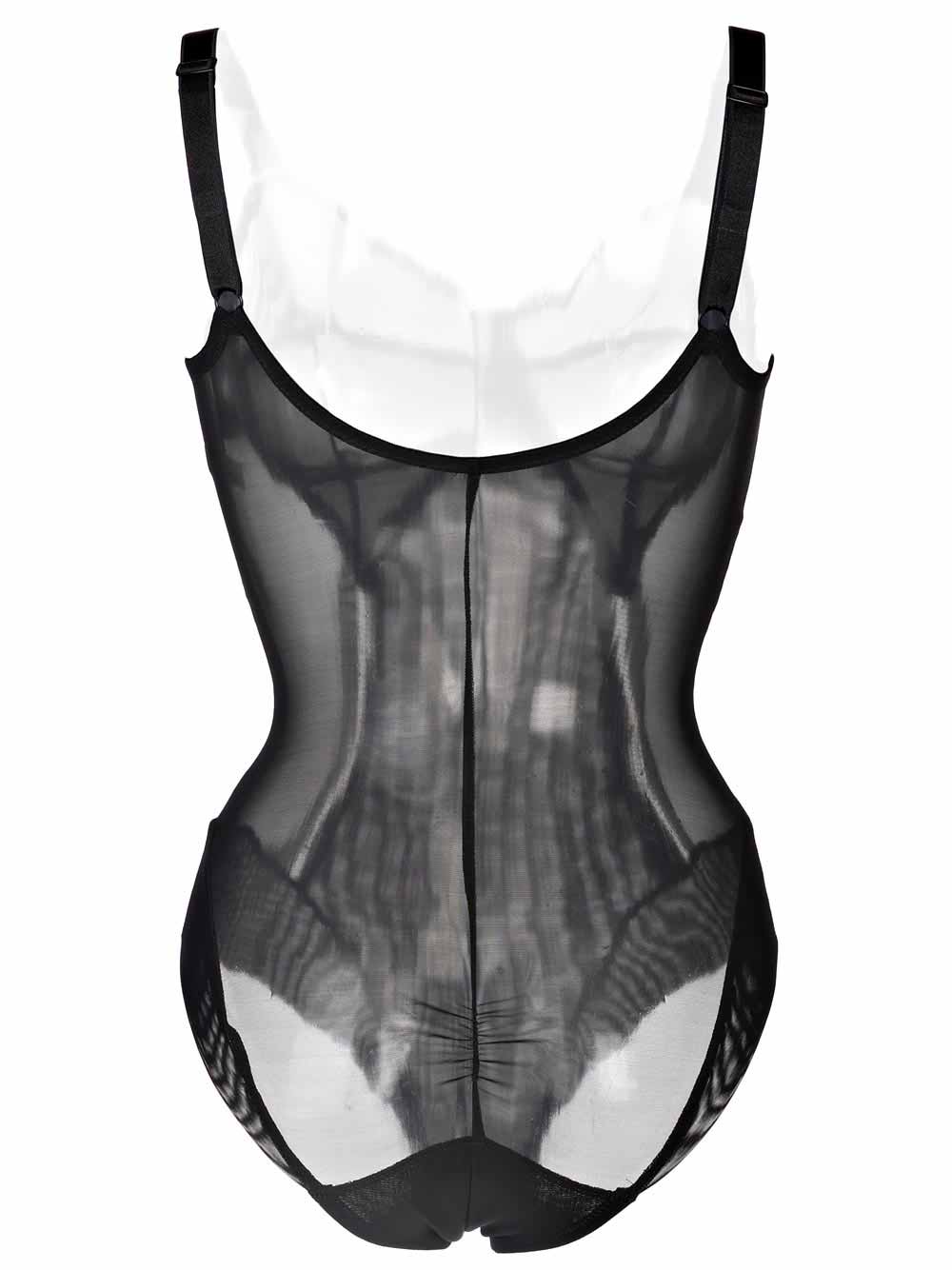 Body tecnico contenitivo color nero, in tulle molto elastico, doppiato sul davanti, sgambatura invisibile, senza ferretto triparte effetto retrò con spallino regolabile.