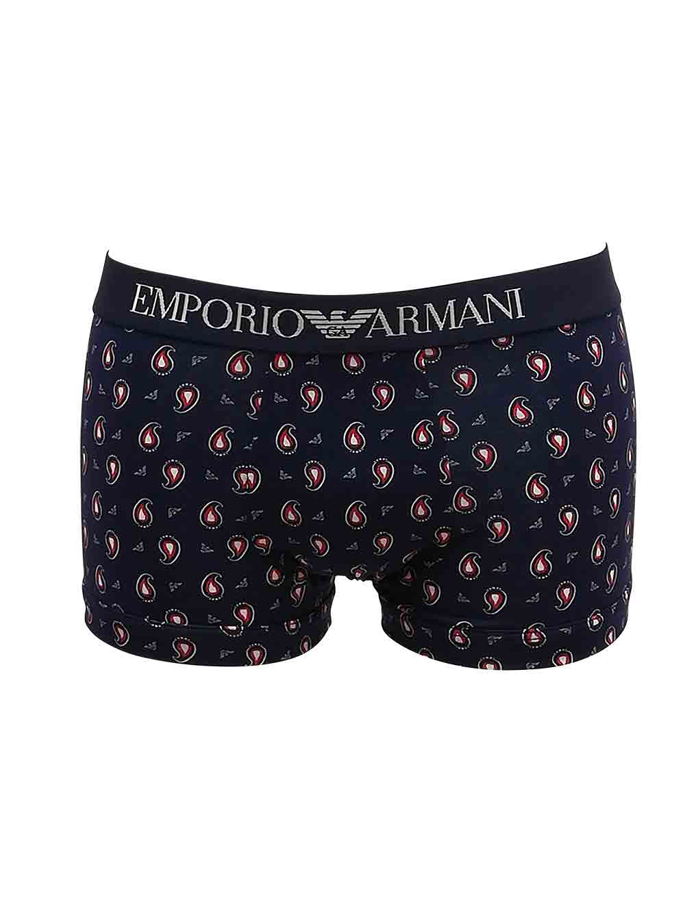 Bipack boxer parigamba uomo in cotone elasticizzato composto da due pezzi: un pezzo blu copiativo unito con elastico in vita su tono logato in bianco centrale; un pezzo fondo blu copiativo con microstampa disegno cachemire più microauilotti sui toni del bianco/rosso, elastico vita blu a tono con logo centrale bianco.