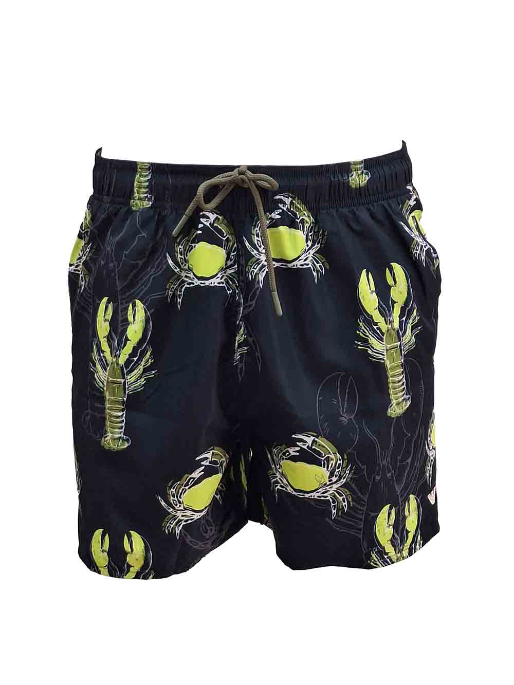 Boxer mare medio uomo fondo blu scuro fantasia granchi/aragoste sui toni del bianco/verde erba/verde militare/grigi in tessuto vela leggero e scivoloso, asciugatura molto rapida, tutto arricciato in vita con laccetto regolabile, tasche laterali a filo invisibili, slip interno a rete.