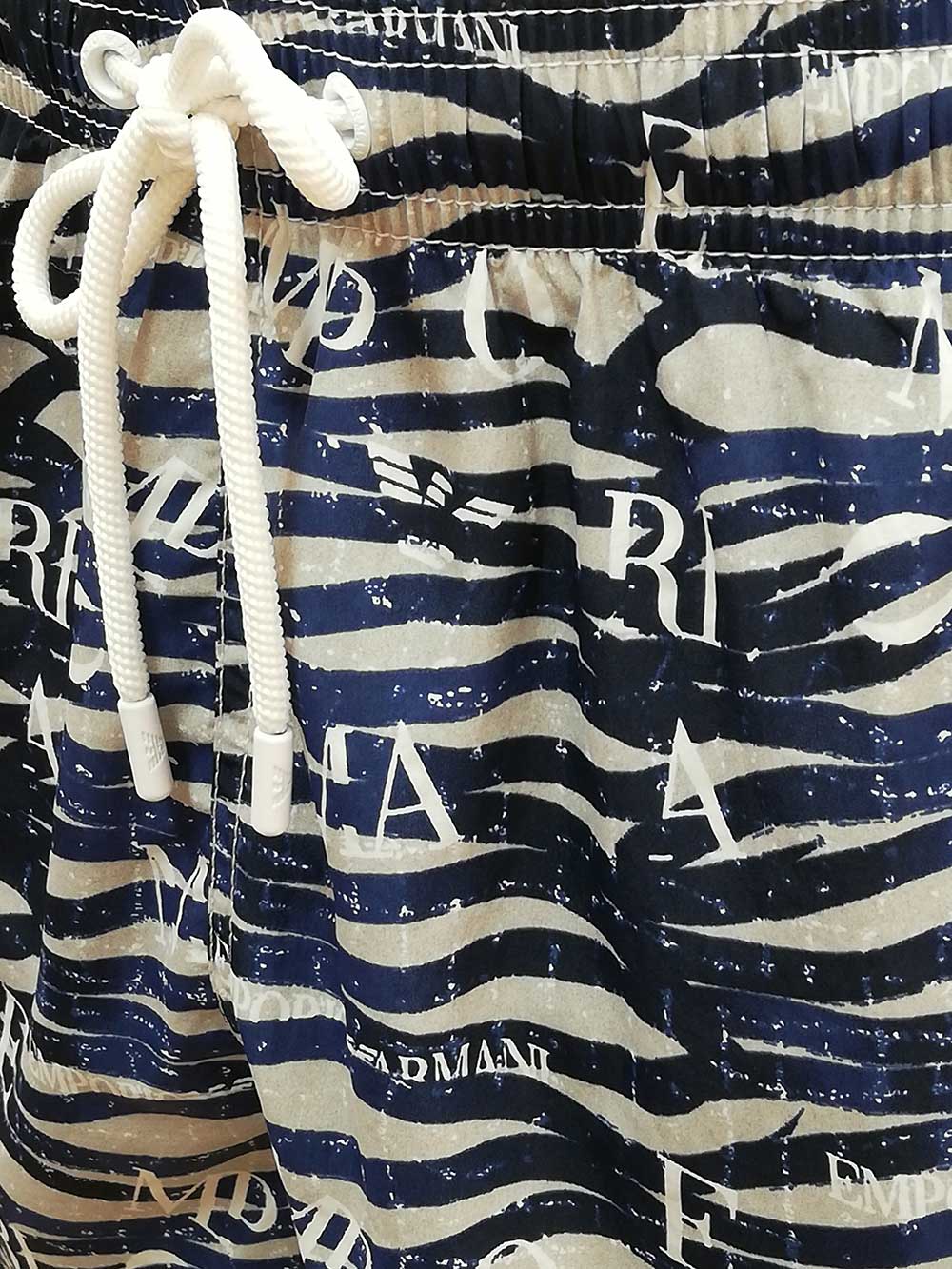 Boxer medio mare uomo in tessuto tecnico asciugatura veloce, fantasia onde sui toni del grigio/blu scuro/azzurro scuro più logatura all-over sui toni del perla, cinturino tutto arricciato con laccetto regolabile a vista, tasca laterale a filo invisibile, slip interno a rete, microspacchetto laterale.