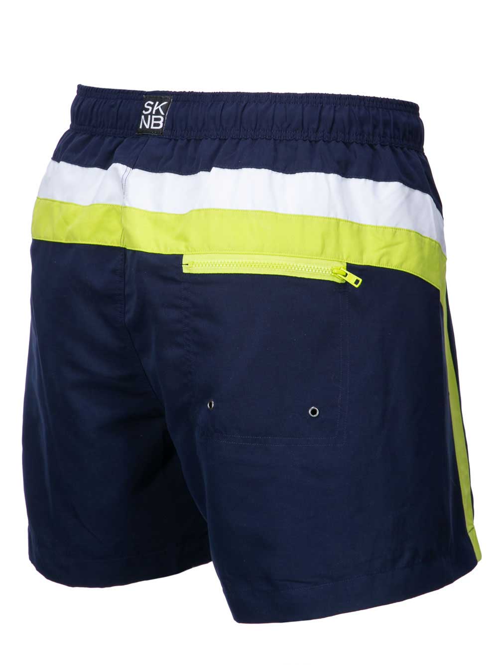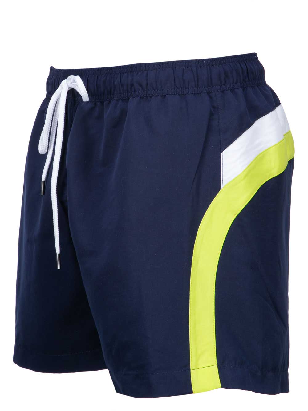 Boxer medio regular mare uomo blu scuro in tessuto microfibra opaca effetto manopesca, laccetto tutto arricciato con laccetto a vista regolabile, bande laterali e dietro bicolor verde acido/bianco, tasca con cerniera sul dietro, slip interno a rete.