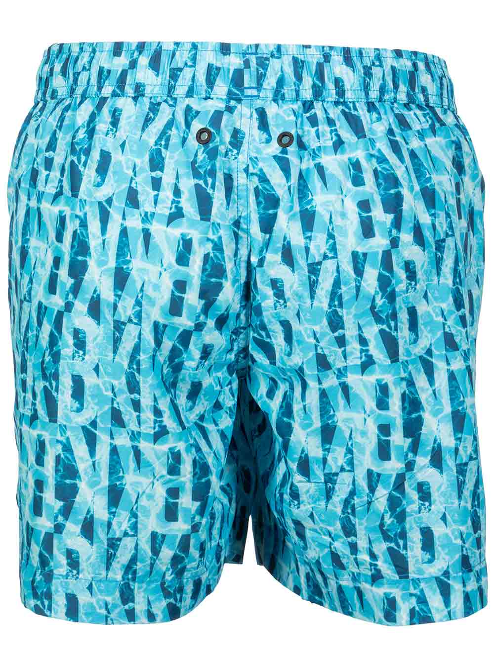 Boxer mare uomo fantasia graphic con fondo acqua più lettere/logo sui toni del blu oceano/celeste/azzurro chiaro/bianco in tessuto vela asciugatura veloce, lunghezza media, cinturino vita tutto arricciato con laccetto regolabile, tasche laterali invisibili, slip interno a rete.