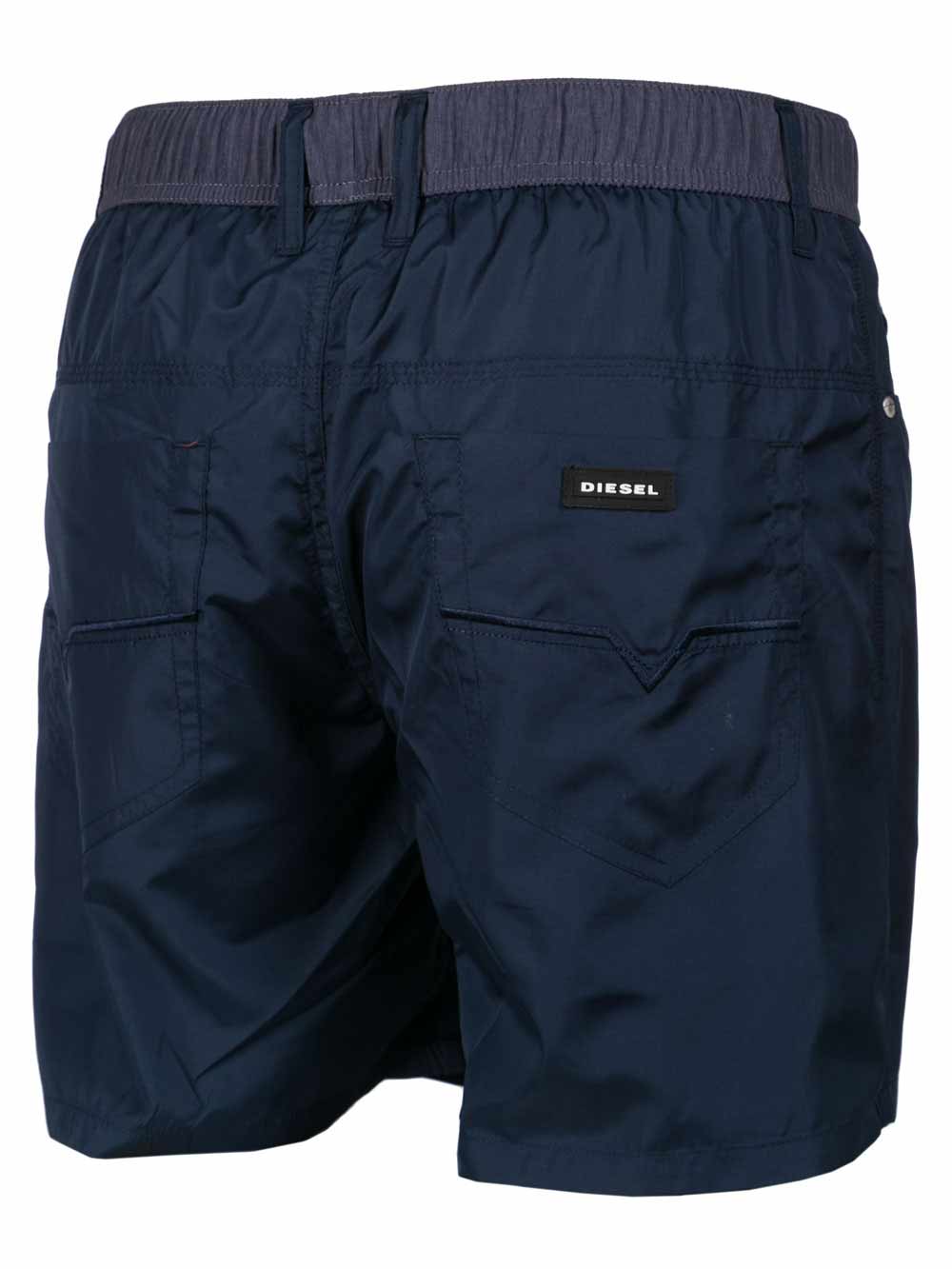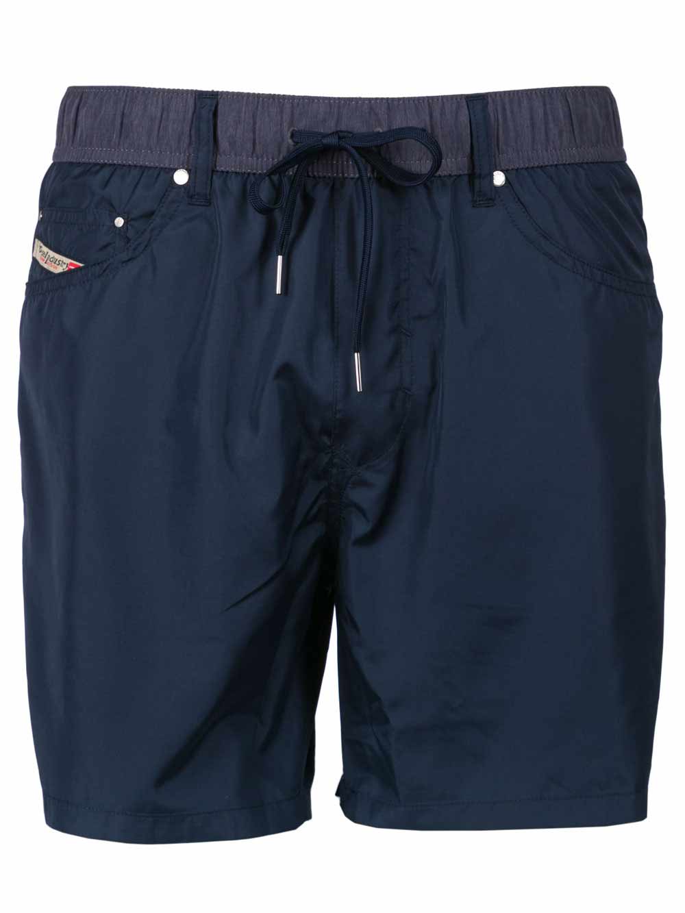Boxer mare medio-lungo blu girovita color blu denim, in tessuto nylon leggero (asciugatura veloce), taglio jeans,arricciato in vita con coulisse regolabile, tasche sul davanti e sul dietro, slip a rete interno. Collezione Primavera Estate 2018.