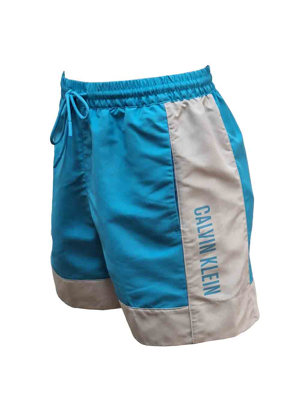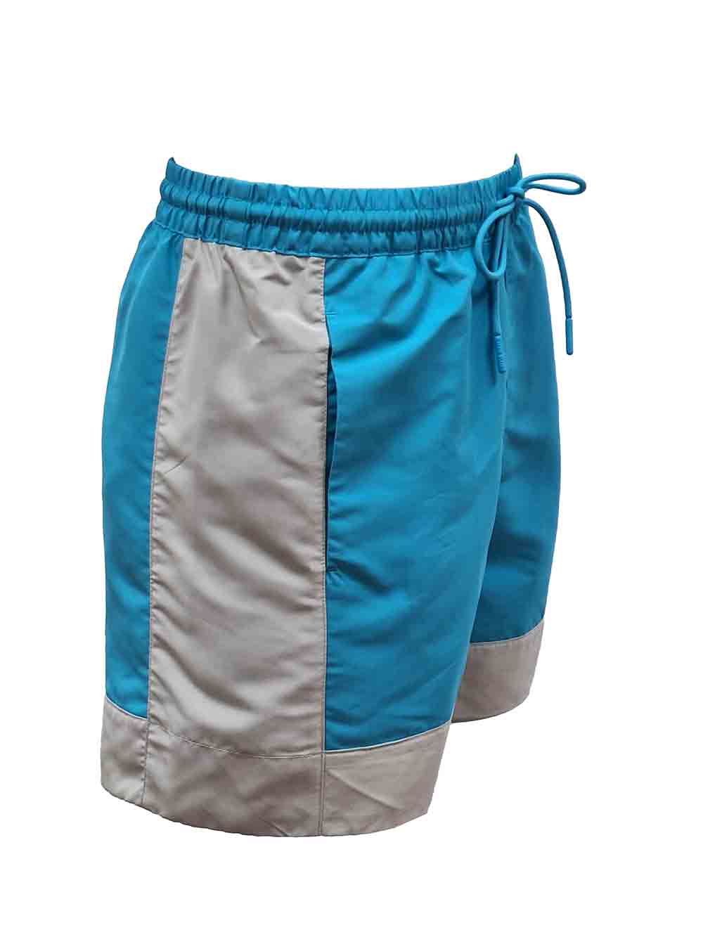 Boxer mare medio uomo bicolor turchese/grigio perla in corposo tessuto vela scivoloso, asciugatura rapida, tutto arricciato in vita con laccetto regolabile, tasche a filo invisibli, no tasche dietro, banda larga laterale grigio perla come la fascia finale in fondo, logo turchese gommato in verticale (no terme), fondo gambale leggermente a stringere, slip interno a rete.
