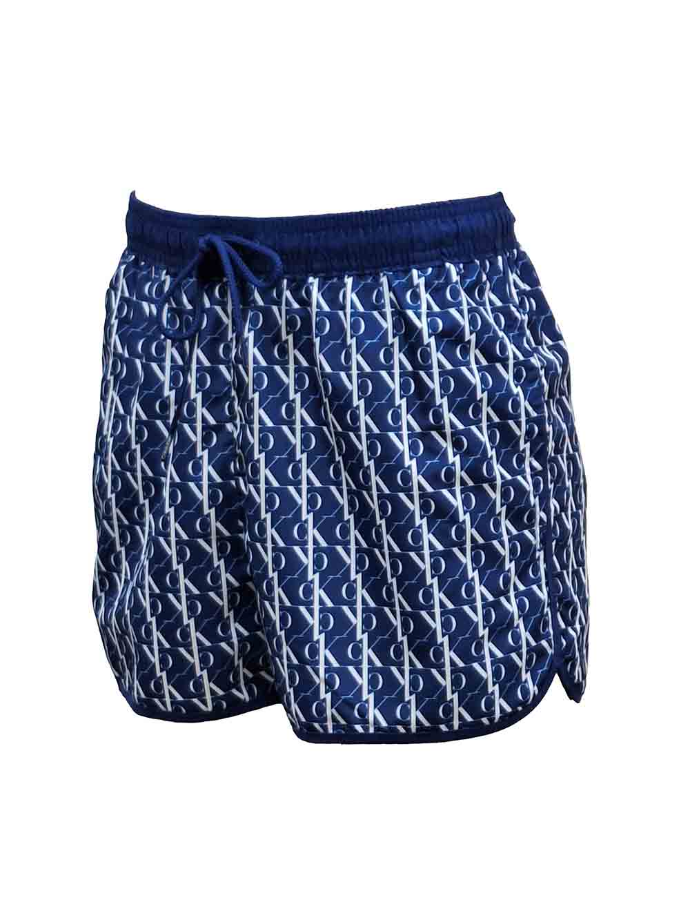 Boxer mare color uomo stile calcio/basket color bluette tutto logato sui toni del bianco, in corposo tessuto vela scivoloso, asciugatura rapida, tutto arricciato in vita con laccetto regolabile, sui fianchi profilo in tessuto azzurro, come sul profilo gambale stondato, tasche laterali a filo invisibili, slip interno a rete,