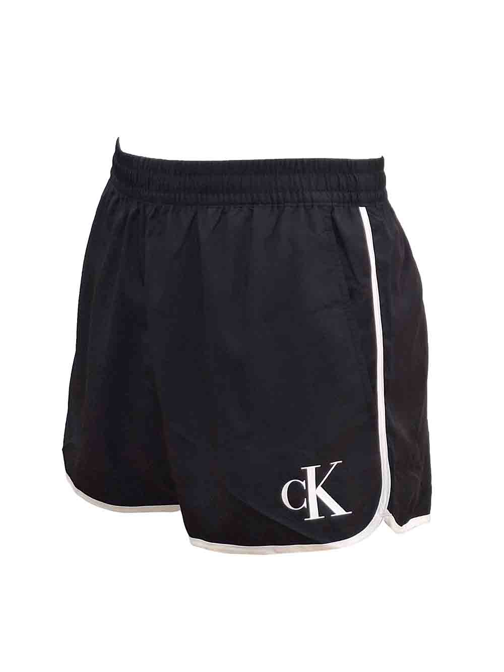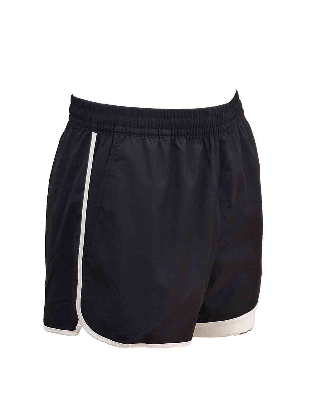 Boxer mare color uomo stile calcio/basket color nero in leggero tessuto vela scivoloso, asciugatura rapida, tutto arricciato in vita con laccetto regolabile, sui fianchi profilo in tessuto bianco a contrasto, come sul profilo gambale stondato, tasche laterali in diagonale, slip interno a rete, su un gambale logo gommato bianco (no stiro).