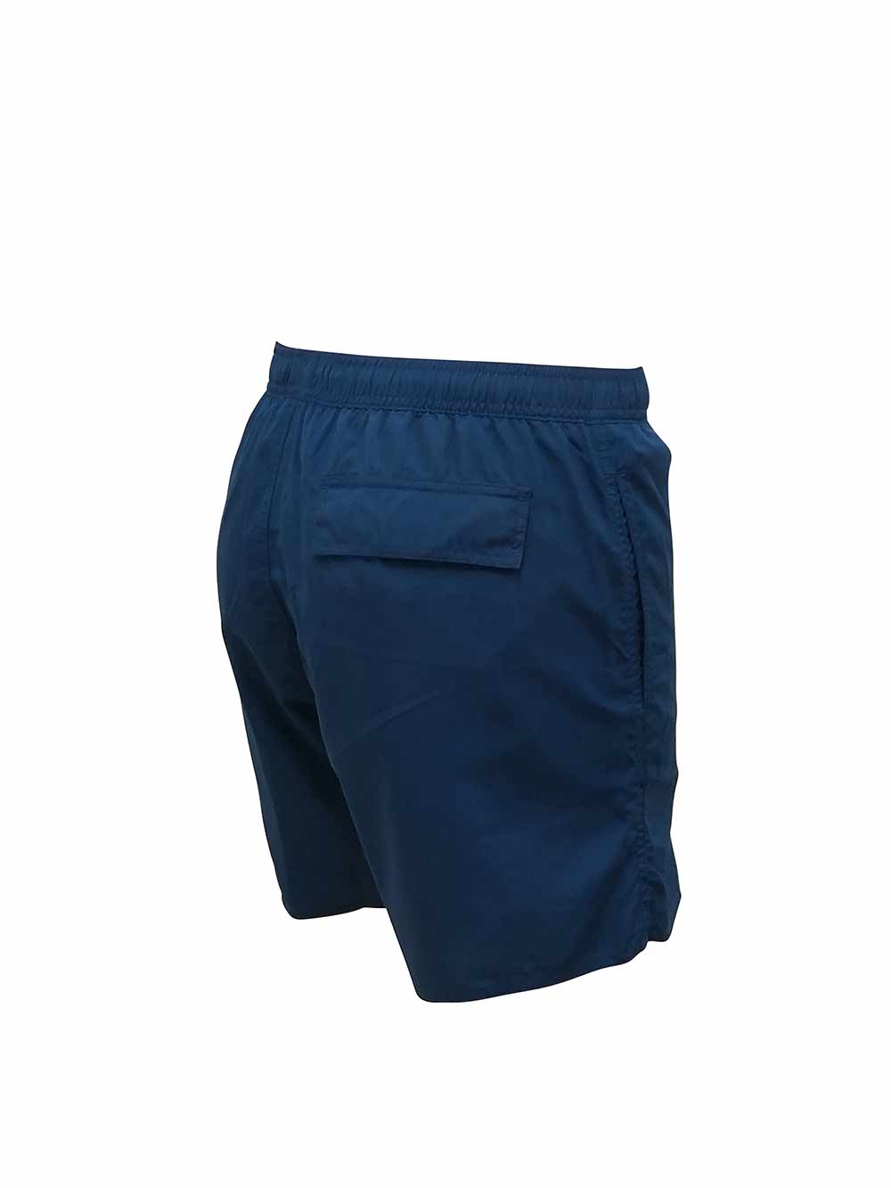 Boxer medio mare blu oceano uomo in tessuto tecnico asciugatura veloce, cinturino tutto arricciato con laccetto regolabile a vista, banda laterale su tono con logo argento/grigio perla, tasca laterale a filo invisibile, tasca sul retro con pattina e strap, slip interno a rete.
