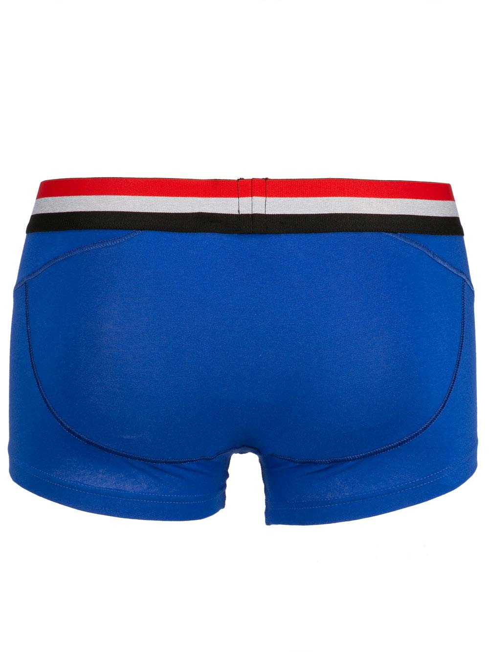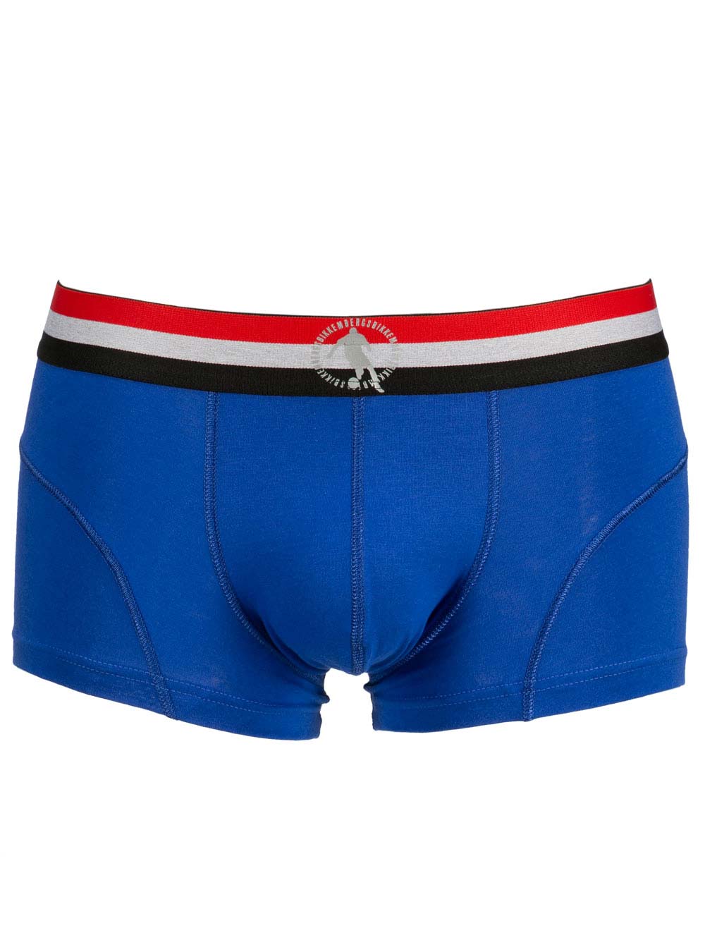 Boxer parigamba uomo bluette in cotone elasticizzato, tutto profilato in filo lucido, elastico in vita tricolor rosso/grigio/nero con logo calciatore centrale. Collezione Primavera Estate 2019.