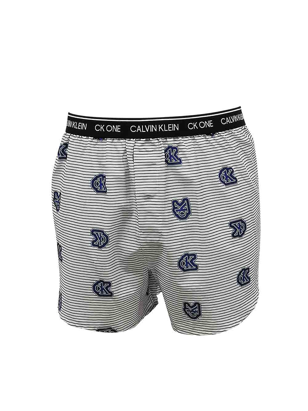 Boxer uomo underwear/sleepwear in tela di puro cotone, fondo bianco microrigato bluette orizzontale più loghi all-over “CK”, bottone invisibile sul davanti con asola, cucitura centrale sul davanti e sul dietro, elastico basso e morbido in vita nero tutto logato girovita in bianco.