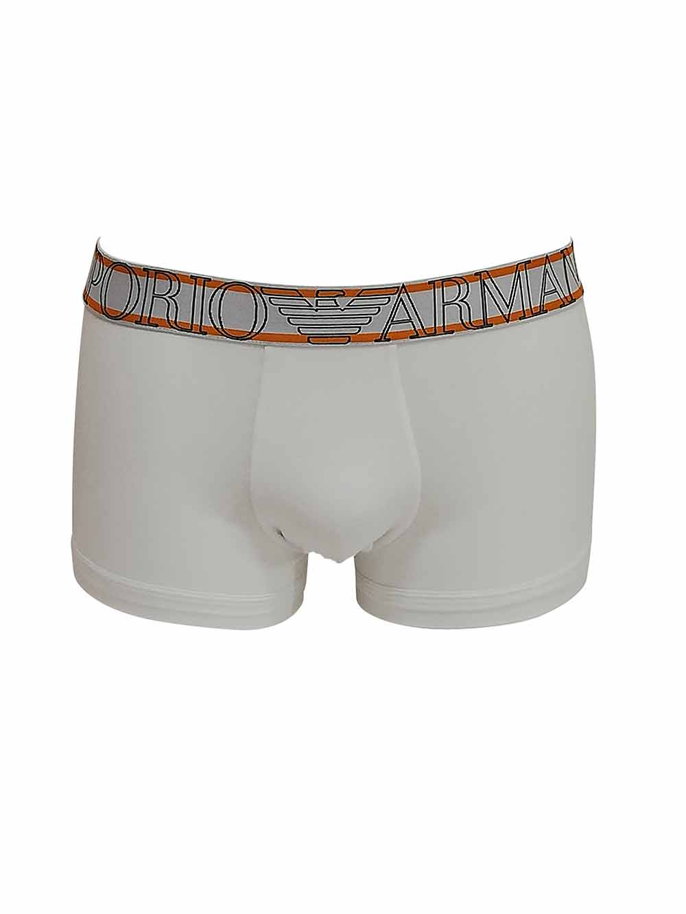 Boxer parigamba bianco uomo in morbido cotone naturale, non trattato, elasticizzato, elastico bianco tutto logato girovita sui toni del blu/ocra.