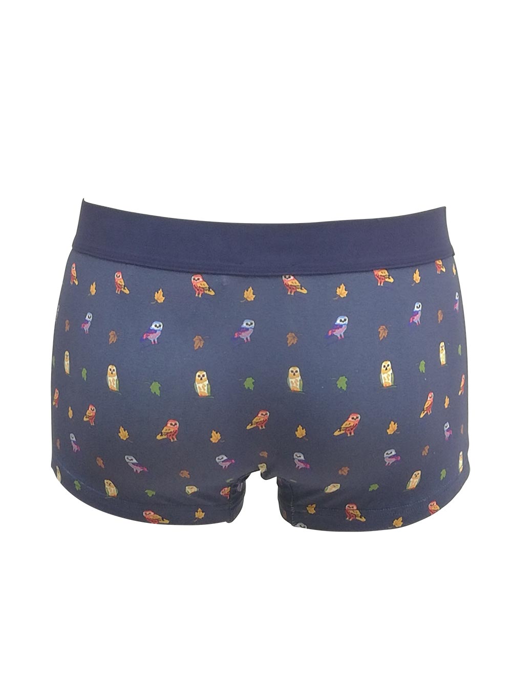 Boxer con gambetta uomo in morbido cotone elasticizzato, fondo blu stampa gufetti/foglie multicolor, elastico tono su tono con tab centrale logato sui toni dell’arancio/viola.