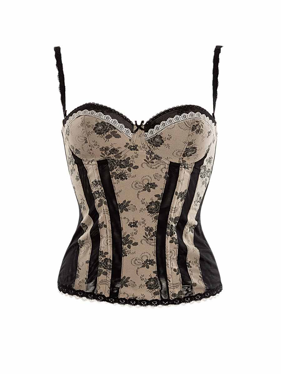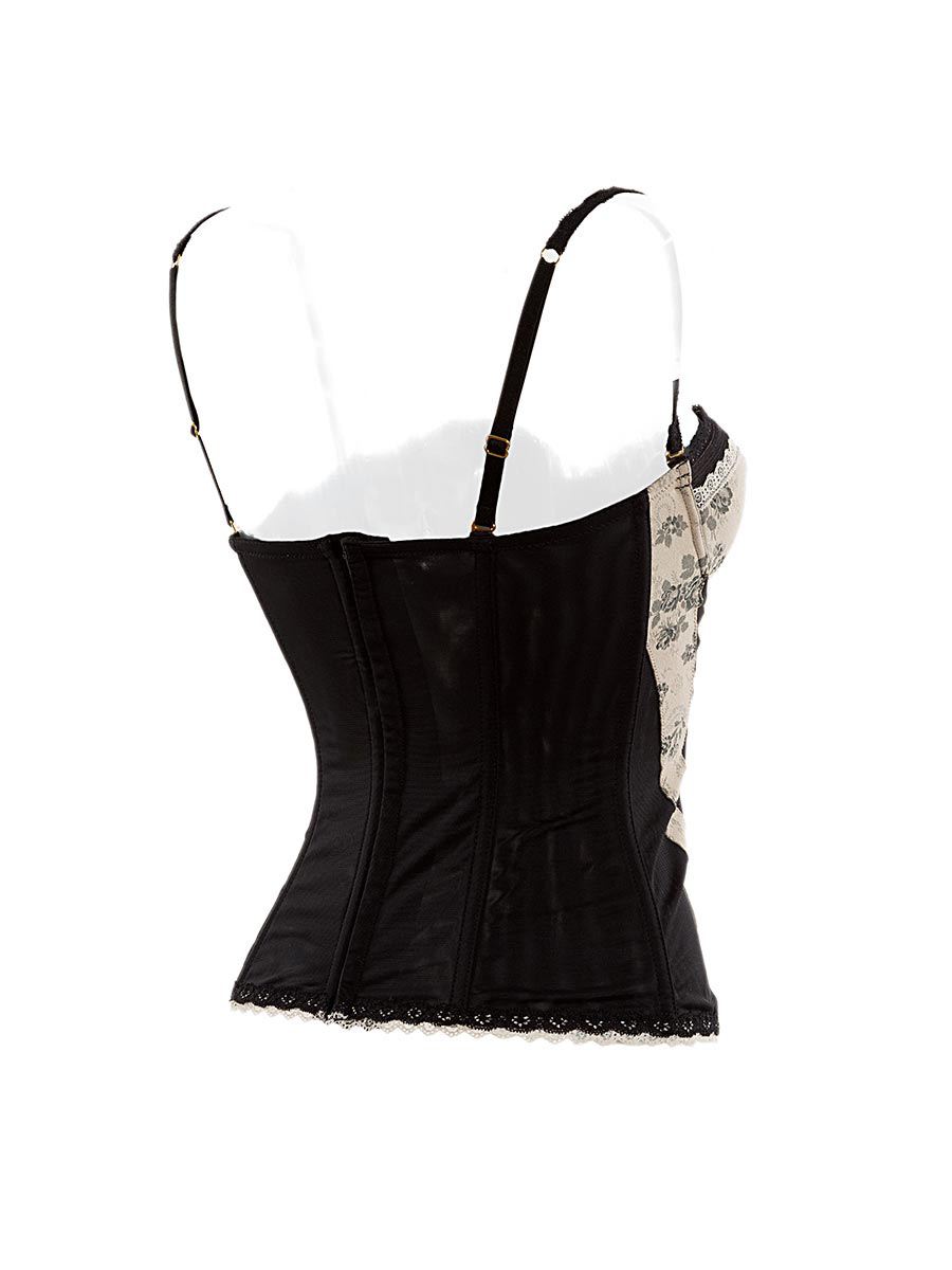 Bustino no stecche, reggiseno a balconette con buona vestibilità, spallini esterni regolabili, contrasto di tessuto damascato a roselline nero con inserti di toulle elastico come sui fianchi, dietro in toulle elastico doppiato con ganci in tre misure.